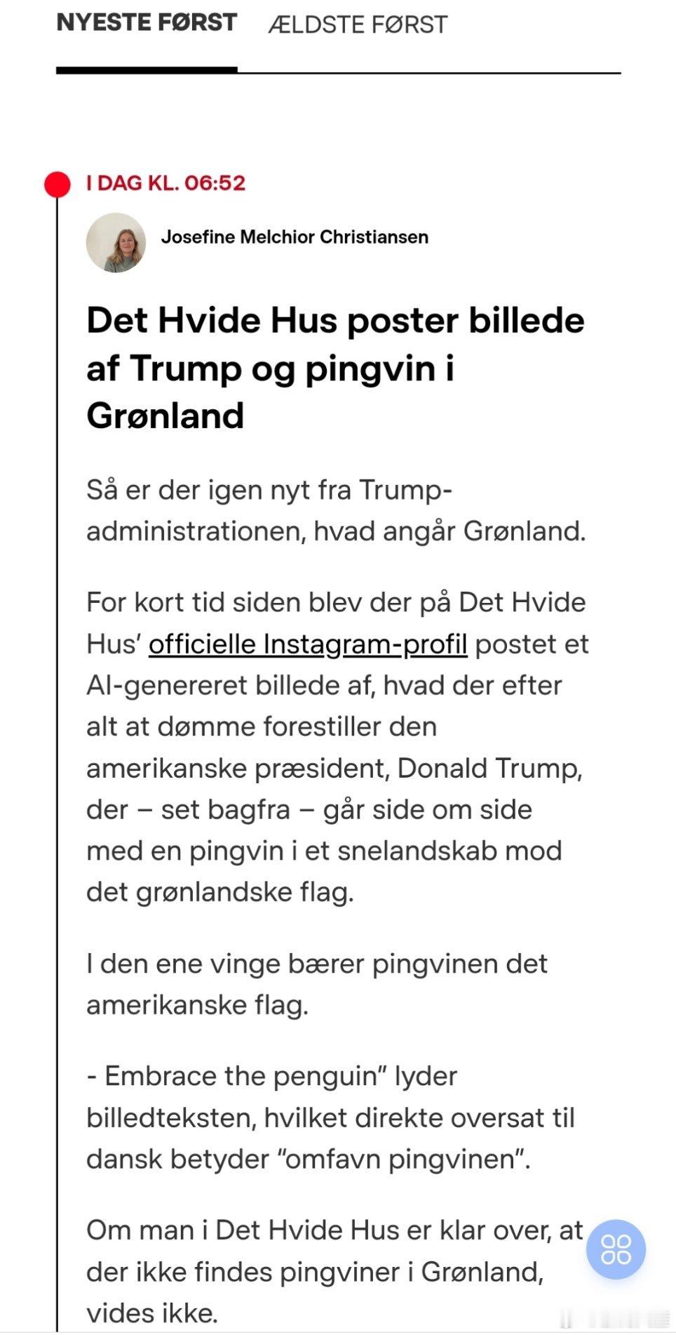 白宫发特朗普在格陵兰岛牵企鹅白宫发布特朗普与企鹅在格陵兰的合影从画面来看,这似乎描绘了美国总统唐纳德·特朗普与一只企鹅并肩而行的场景:特朗普背对着镜头,两人站在雪地中,背景是格陵兰国旗。(丹麦广播公司官网)