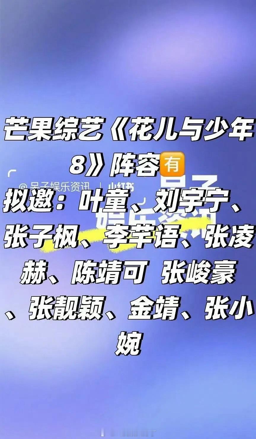 《花儿与少年8》的拟邀阵容:叶童、刘宇宁、张子枫、李芊语、张凌赫、陈靖可、张峻豪、张靓颖、金靖、张小婉这个阵容有变动吗?花儿与少年8