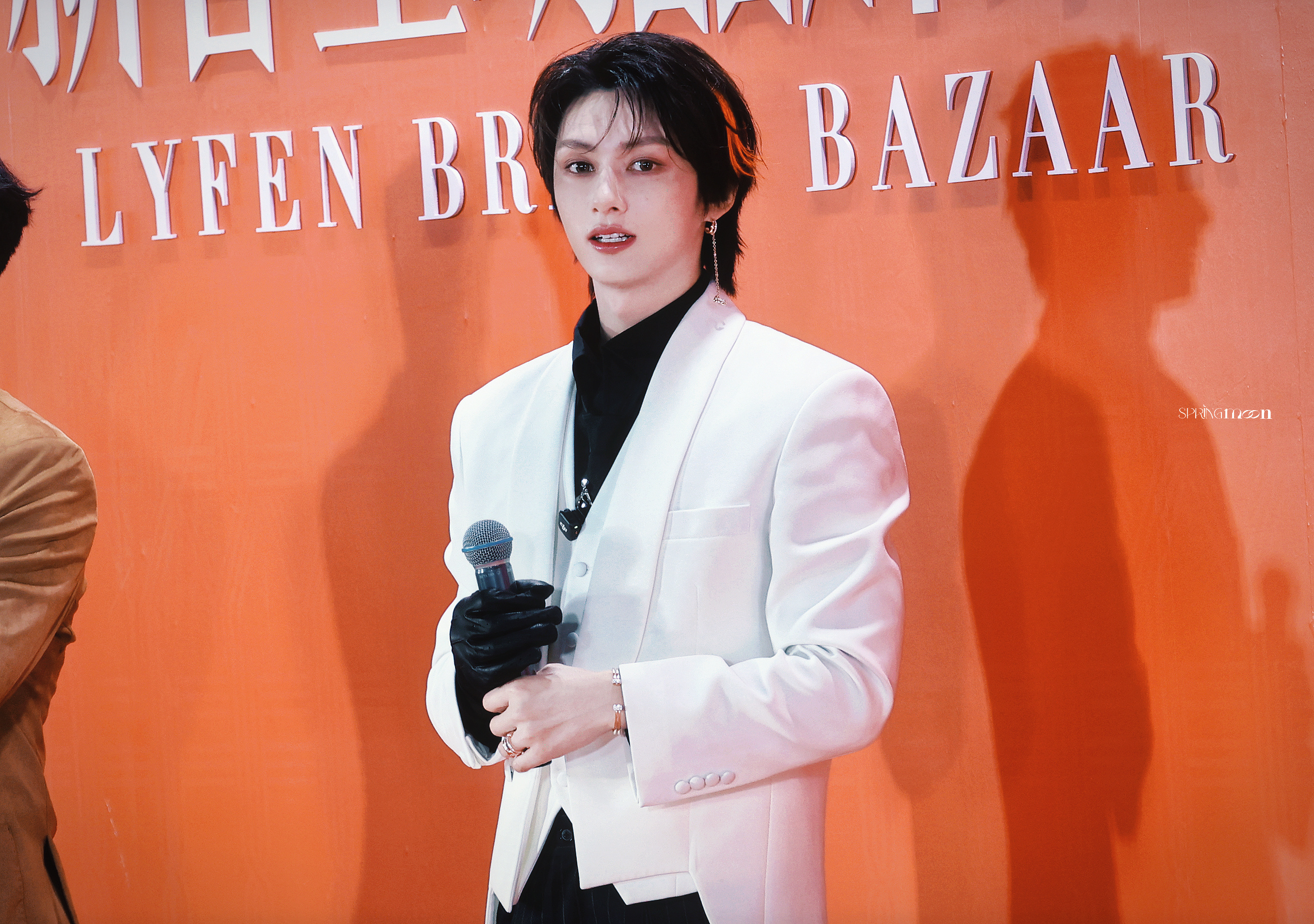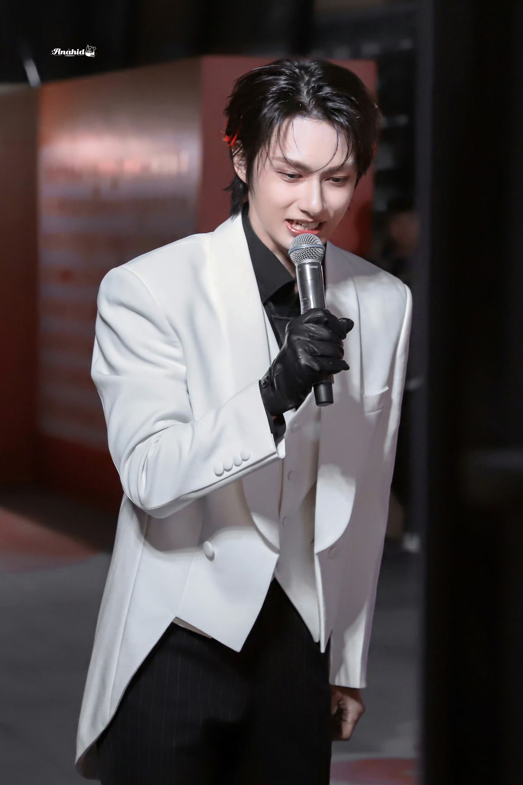 文俊辉发型师出来挨夸 暗黑古堡王子来的!白色西装黑色内搭,单只皮手套,一抹红色挑