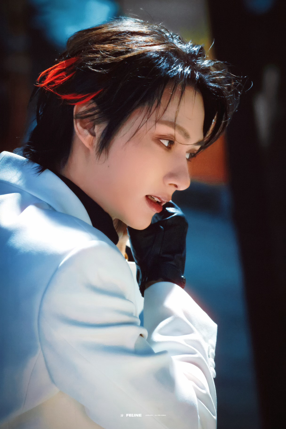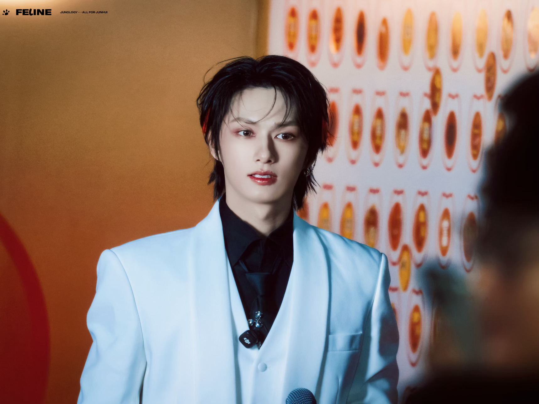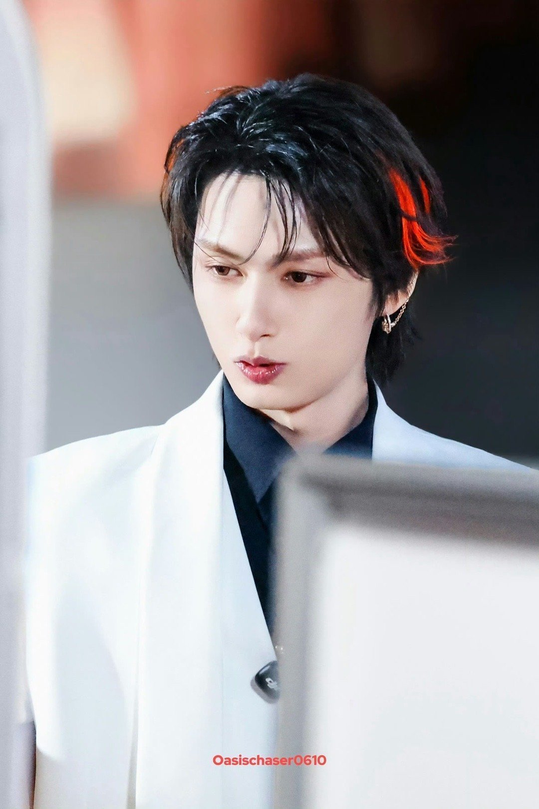 文俊辉发型师出来挨夸 暗黑古堡王子来的!白色西装黑色内搭,单只皮手套,一抹红色挑染更是绝了
