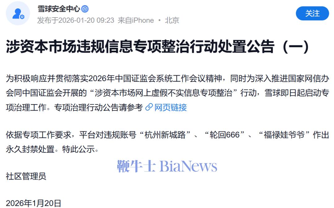 作为投资社区,雪球公布四大整治重点:打击过度炒作诱导跟风、打击非法咨询违规导流、打击团伙化操控、打击编造虚假信息。被永封的账号多涉及“游资战法”“带队晒盘”等行为,这些曾吸引流量的做法如今成为重点打击对象。
