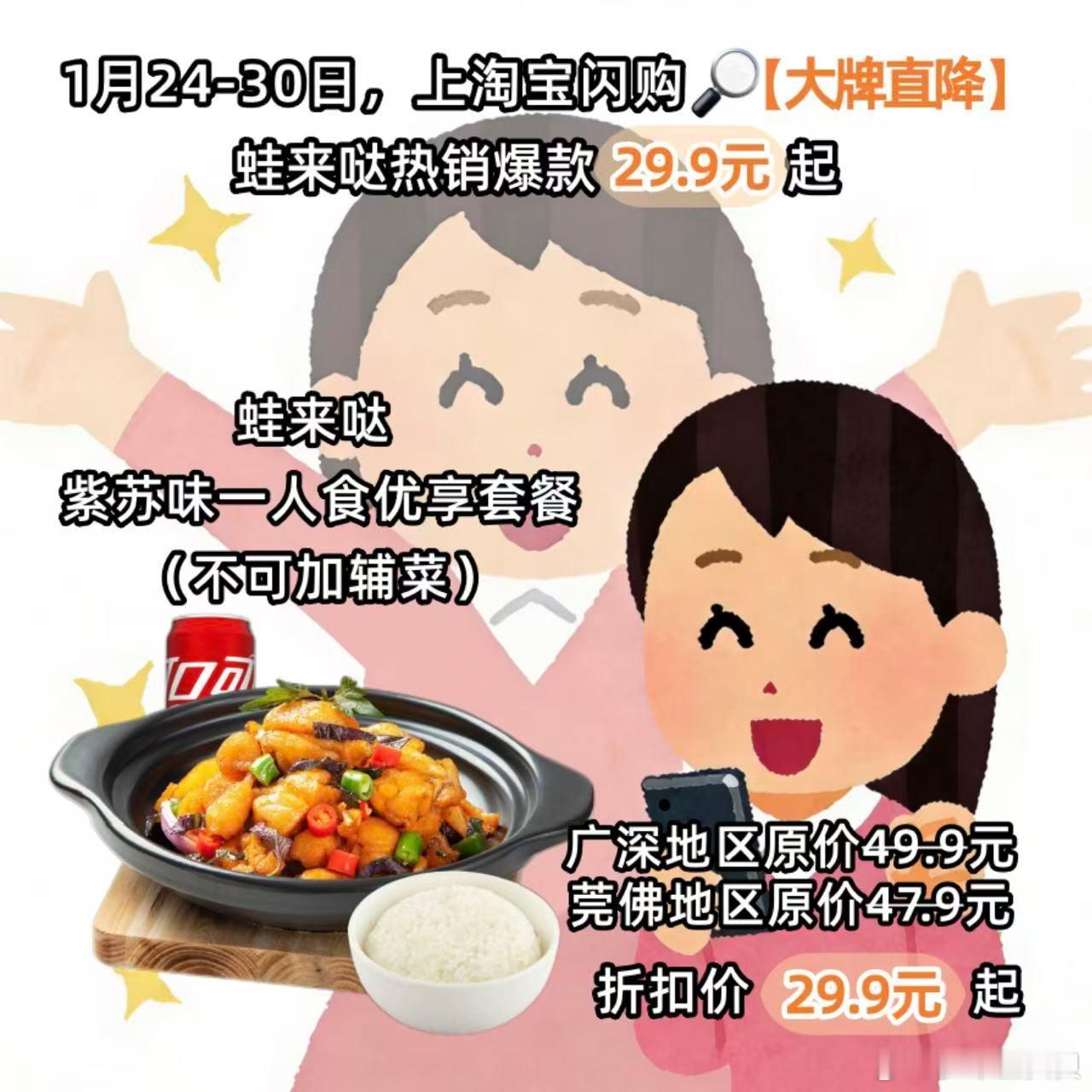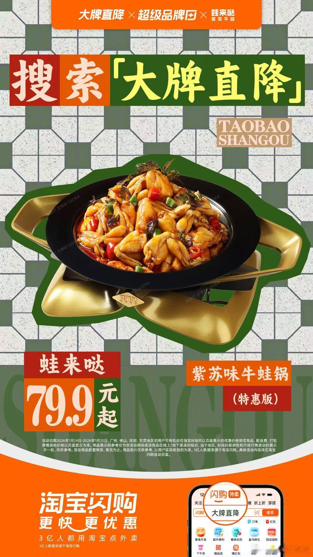 周六晚的浪漫,不一定需要西餐红酒。上淘宝闪购大牌直降实现吃蛙自由一份热辣鲜香的双人蛙锅,一样情调十足!淘宝闪购大牌直降 推荐蛙来哒香辣味牛蛙锅(特惠版)79.9元起,分享同一份热辣,感情迅速升温;再加一份紫苏味牛蛙锅(特惠版)79.9元起,平衡辣度。在暖黄的灯光下,互相夹菜,聊聊一周趣事,轻松又惬意。省下订位选餐厅的纠结,留翻浪漫给彼此的相处时光。1月24日-1月30日,淘宝闪购搜索【大牌直降】,蛙来哒热销爆款29.9元起。你和TA的周末晚餐喜欢怎么安排?