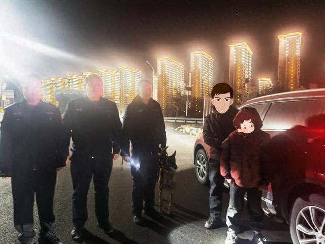 找寻行动一直延续至次日晚,当训导员带着追踪犬行至336国道红柳林村一偏僻路段时,追踪犬突然停下脚步,示意发现异常。与此同时,空中无人机也传回实时画面,热成像清晰捕捉到该杂物堆处有一处明显热源点。民警与警犬训导员立刻上前查看情况,发现一男孩嘴唇发紫、双手通红颤抖,独自蜷缩在角落,民警当即脱下警服为其御寒保暖,并递上温水和食物,轻声安抚,缓解孩子的恐惧与不适。