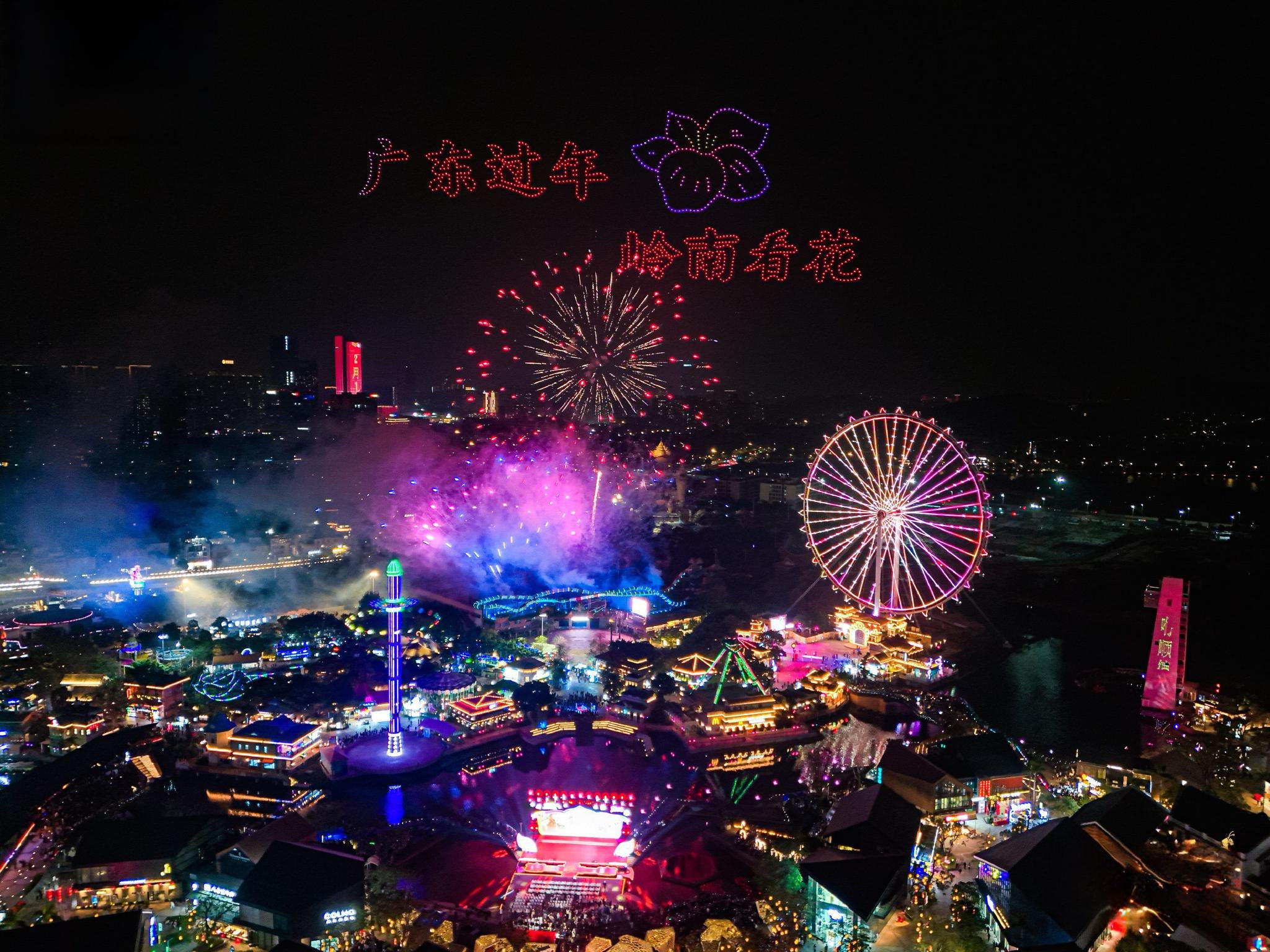 舞台环节,开场舞《龙马精神贺岭南》、非遗时尚秀《岭南印迹·非遗风尚》、经典金曲串烧《粤来粤好声声不息》、广东动漫IP人偶与童声合唱团同台演绎《纸飞机》等节目,生动演绎了岭南文化的创新活力与深厚底蕴。活动尾声,无人机编队与璀璨烟花共同呈现“请到广东过大年”字样,点亮湾区夜空,将气氛推向高潮。