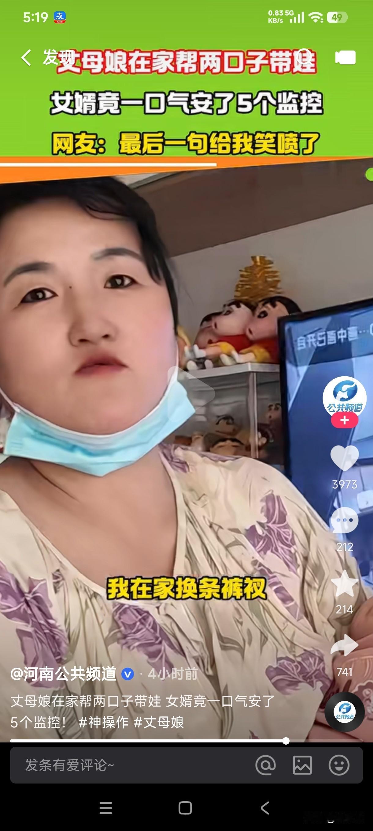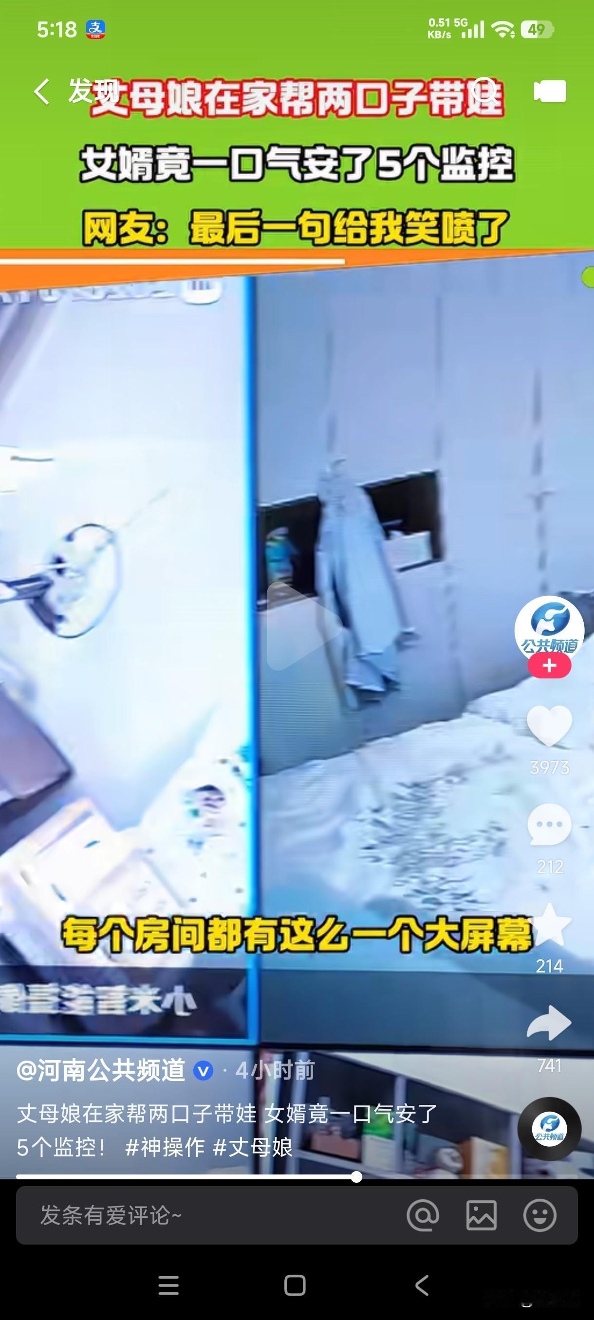 丈母娘帮女婿带孩子,女婿一口气在家装5个监控,并且每个房间都有一个大屏幕,丈母娘说她想换条裤衩提溜几圈都找不到地方可换,这是不放心孩子呢还是在监视自己呢? 这女婿两口子也是个人才,家里装监控也不稀奇,但一口气在家装5个监控的还真是没有见过,装监控也就算了,还在每个房间都装了一个大屏幕,这到底是为了时时刻刻都能看到孩子呢?还是为了时时刻刻都监视丈母娘呢?这丈母娘想换条裤衩都没地方可换,家里随处都是监控和大屏幕,这女婿一直在拿着手机看,这丈母娘连点隐私都没有,这女婿是不是太不厚道了,你最起码给丈母娘留点私人空间不是吗?