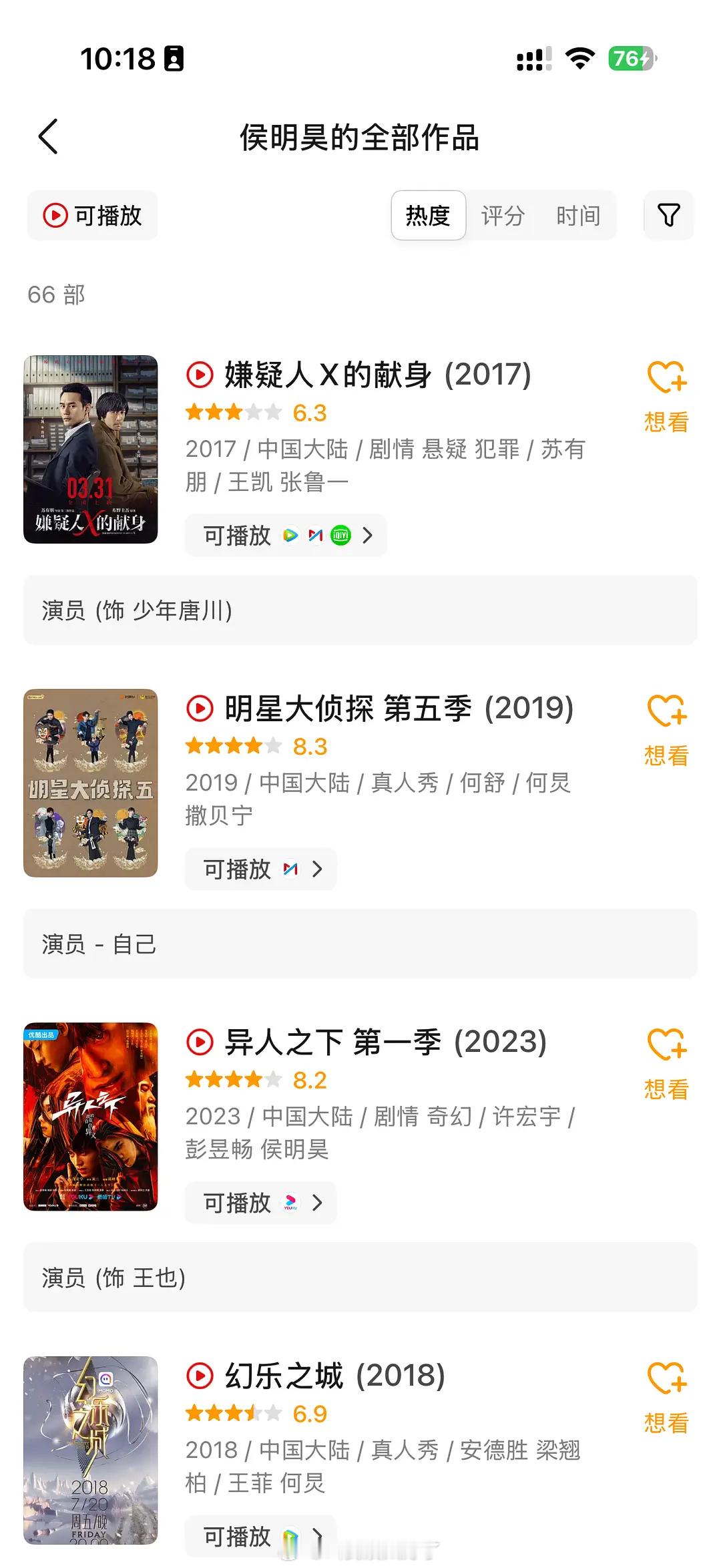 大家感觉侯明昊算资源咖吗?影视作品综艺+剧都算上有66部,虽然不一定一番,但都是