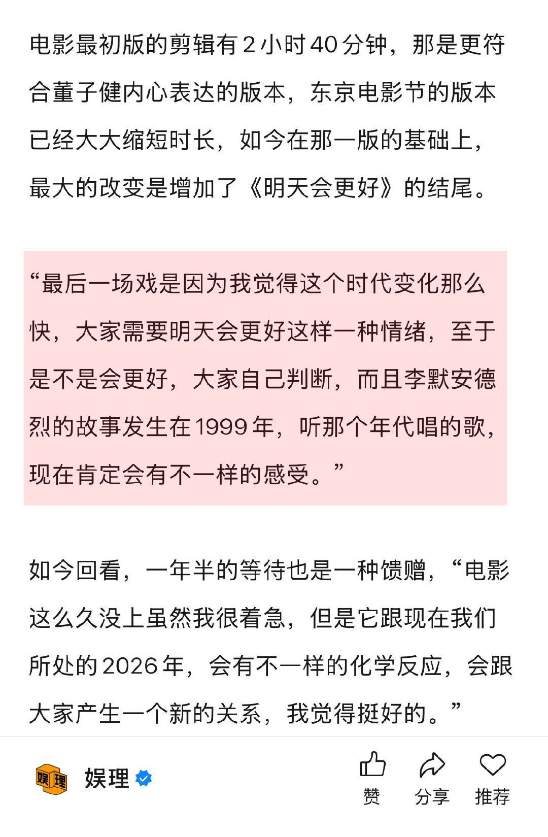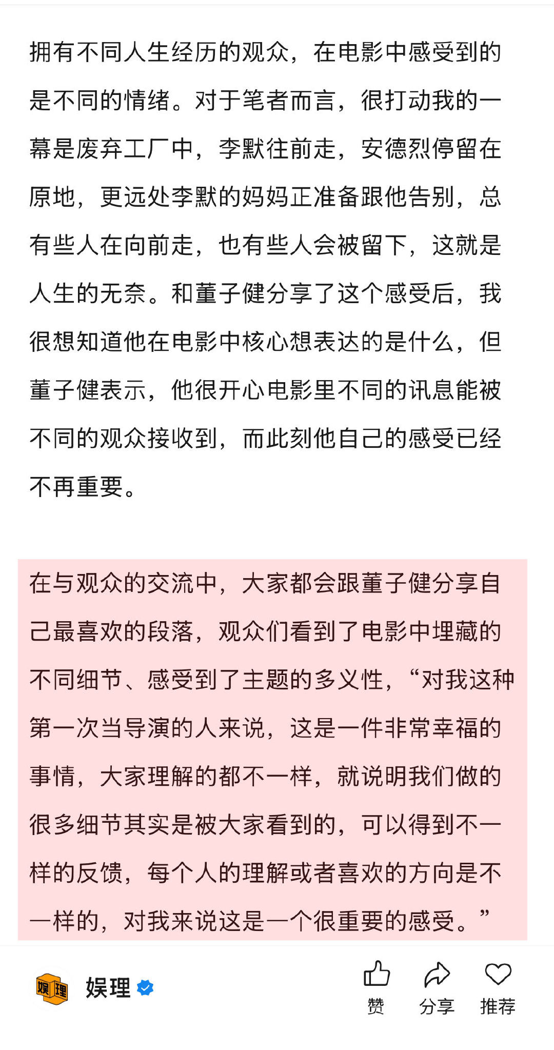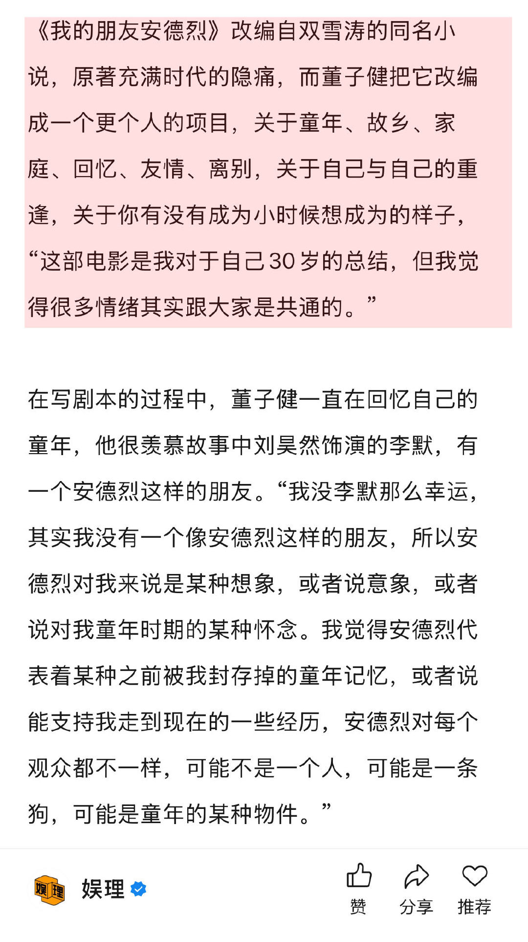 董子健说上网搜自己更多是紧张 安德烈是董子健对自己的30岁总结《我的朋友安德烈》改编自双雪涛的同名小说,原著充满时代的隐痛,而董子健把它改编成一个更个人的作品,关于童年、故乡、家庭、回忆、友情、离别,关于自己与自己的重逢,关于你有没有成为小时候想成为的样子,“这部电影是我对于自己30岁的总结,但我觉得很多情绪其实跟大家是共通的。”娱理独家↓