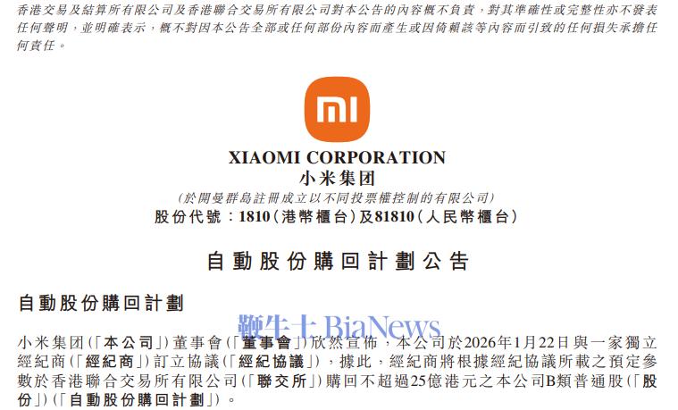 小米集团发布公告,称于1月23日开启一项由第三方独立券商操作的25亿港元的自动股份购回计划。小米表示,该计划展示出公司对自身业务前景充满信心,符合公司及股东的最佳利益。