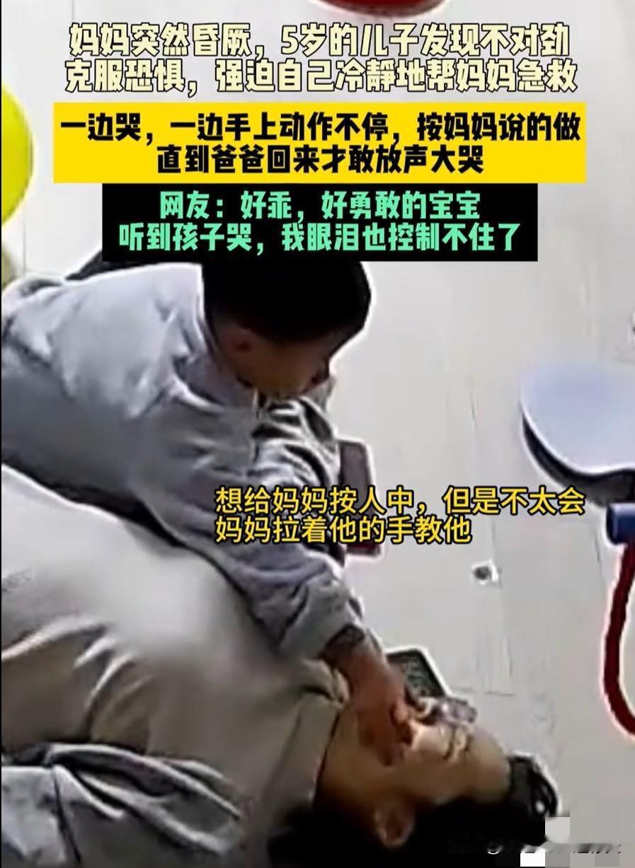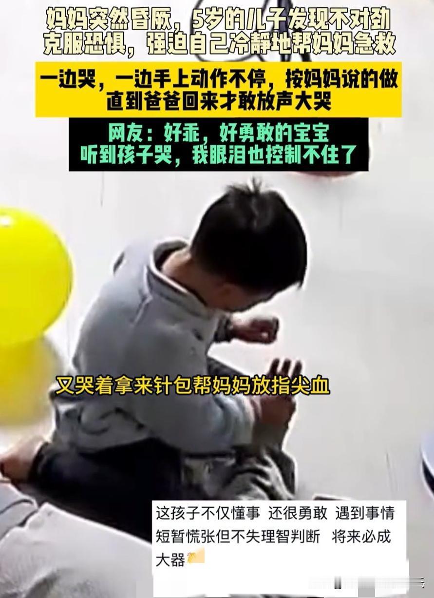 泪崩!隔着屏幕看着太心疼了 山东5岁男童强忍泪水救晕倒妈妈 全程听指挥太戳心 1月19日,山东一位妈妈带着5岁的孩子在家,妈妈正准备朝凉杯中加水时,突然手脚一下子失去了意识,后仰着倒地不起。儿子发现后立刻跑了过来,随后听着妈妈的指挥,强忍泪水给妈妈施救,直到爸爸回来那一刻才崩溃大哭。孩子拿起手机给爸爸打了电话后,就一直趴在妈妈的身上。这时,妈妈用微弱的声音一步步教他怎么做,先掐人中再去把放血的指针盒拿过来,帮妈妈扎指尖放血。 真的看一次鼻酸一次!才5岁的孩子,本该是黏着妈妈要抱抱、遇到一点小事就哭鼻子的年纪,却在妈妈突然晕倒的那一刻,硬生生把害怕憋在心里,跟着妈妈的指令一步步做施救动作。电话里跟爸爸报信时,声音都在抖却没掉一滴泪,直到爸爸推门进来的瞬间,所有的恐惧和委屈才敢放声大哭,谁看了不心疼。 这孩子的冷静从来都不是天生的,一定是妈妈平时就有意识地教过他一些基础的应急小知识,哪怕只是告诉孩子急救箱在哪、简单的求救方式,没想到关键时刻真的派上了大用场。 反观我们身边,太多家长总觉得孩子还小,这些事不用懂,把孩子护在蜜罐里,却忘了意外从来不会因为孩子小就绕道走。前阵子就有新闻说,有孩子面对家人突发疾病,只会坐在地上大哭,连120都不知道怎么打,最后还是邻居发现才化险为夷。 其实应急教育从来都不是什么超前教育,而是孩子成长里的必修课,不用教多复杂的技巧,记住爸妈的手机号、知道打120说清家里的地址、家里的急救箱在哪、遇到有人晕倒别随便搬动,这些简单的知识点,关键时刻可能就是生死距离。 这个山东妈妈的做法,真的给所有家长提了个醒:爱孩子,不只是给他遮风挡雨,更要教他学会自己撑伞。而这个小男子汉的勇敢,也成了妈妈最暖心的铠甲,小小年纪就懂得守护家人,真的太赞了! 5岁男童冷静施救晕倒妈妈 亲子应急教育有多重要