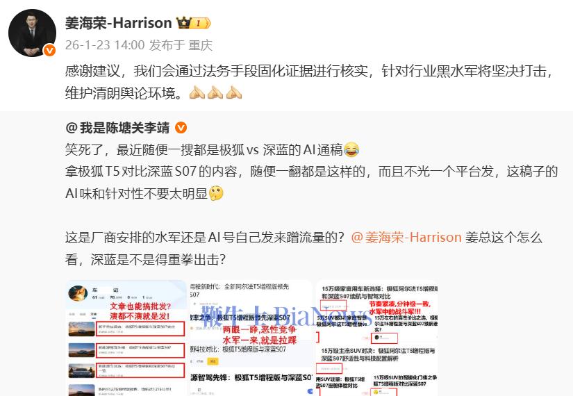 深蓝汽车CEO姜海荣转发该博文并回应:“感谢建议,我们会通过法务手段固化证据进行核实,针对行业黑水军将坚决打击,维护清朗舆论环境。”