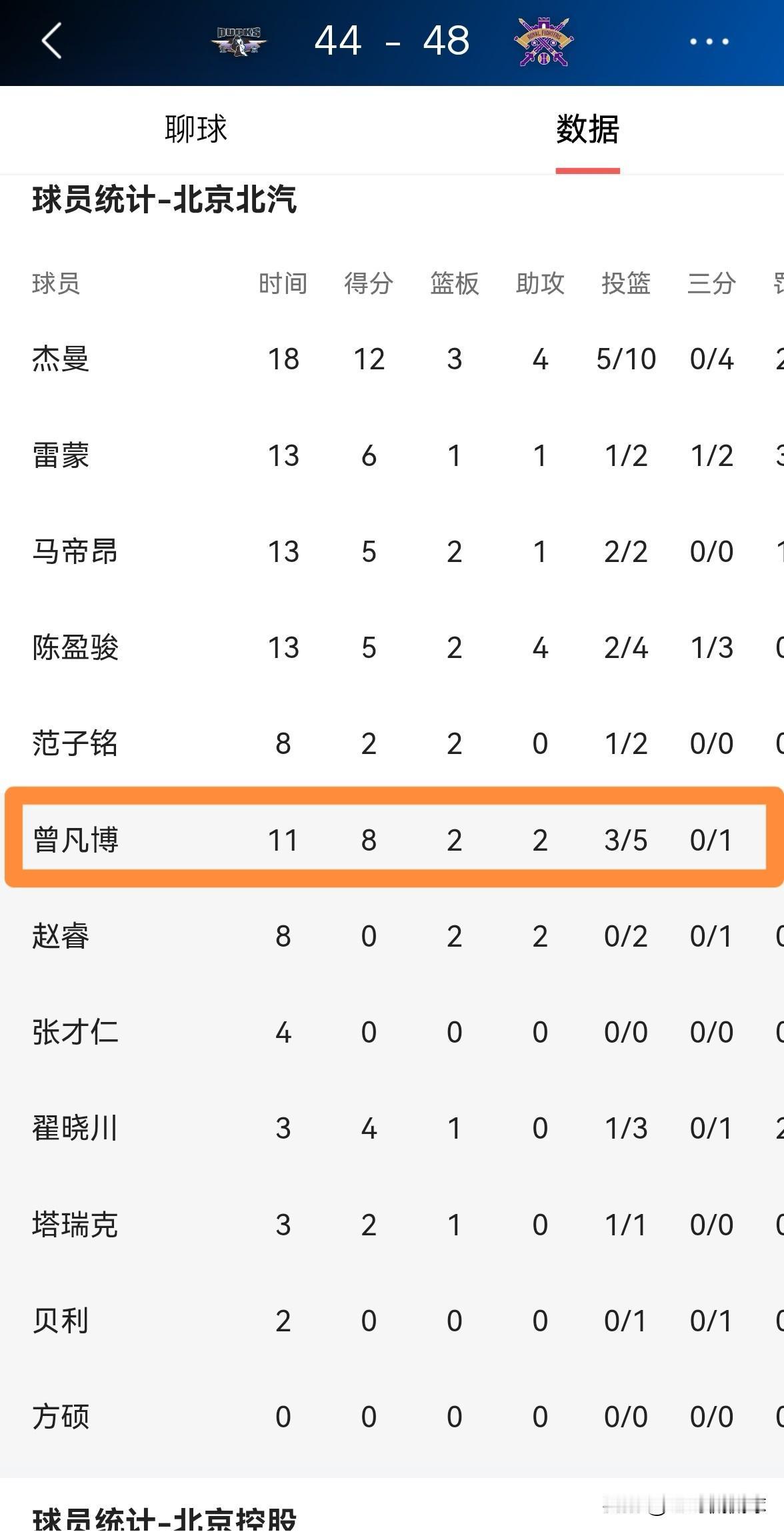 北京北汽大将曾凡博的状态真是太火热了!在今天北京北汽主场迎战北京控股的比赛中,目前双方半场战罢,虽然北京北汽以44:48落后于对手,但是伤愈复出的曾凡博却在攻防两端都展现出了非常火热的状态。 在前两节比赛中,曾凡博替补出场11分钟,投篮5中3,其中三分球1中0、罚球2中2非常高效的得到8分,还有2篮板2助攻1盖帽,没有出现任何的失误,他的场上正负值为+1。 老实说,如果北京北汽想要赢下本场比赛,那么曾凡博必须在下半场比赛中延续自己的好状态。