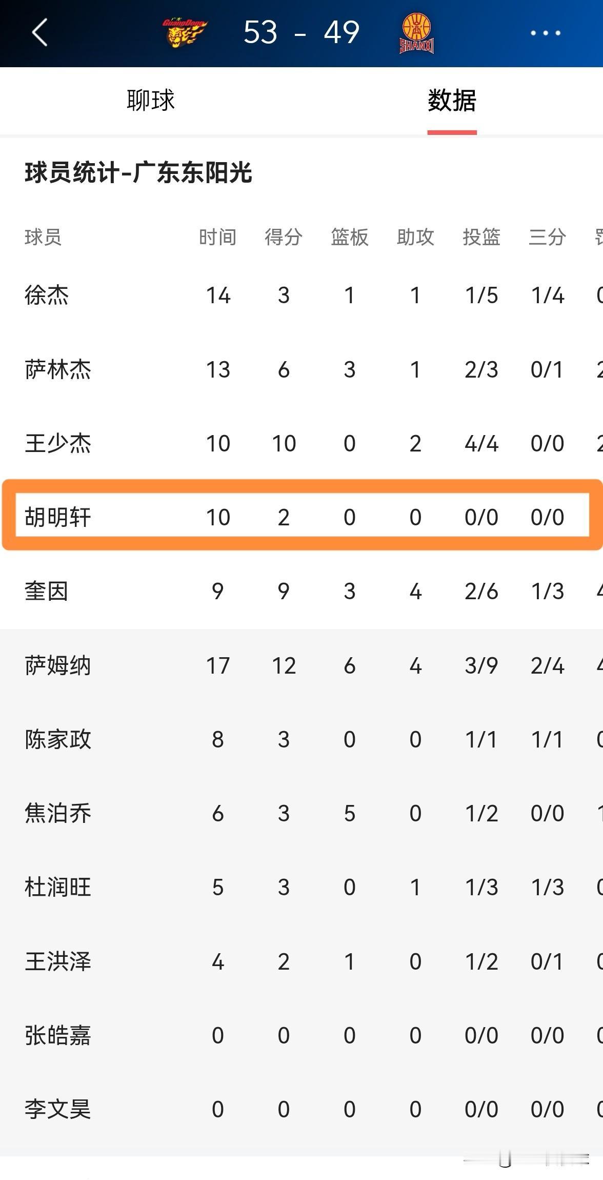 广东东阳光球星胡明轩真是毫无得分欲望!在今天进行的广东东阳光和山西汾酒的比赛中,目前双方的上半场比赛已经结束,广东东阳光暂时以53:49领先对手。让人感到特别意外的是,在前两节比赛中,胡明轩在首发出战的18分钟里竟然零出手,仅仅依靠罚球得到2分,也没有篮板、助攻和抢断入账,他的场上正负值为+3。 虽然胡明轩在上半场比赛中没有得分欲望,但是他在防守端却拼劲十足。