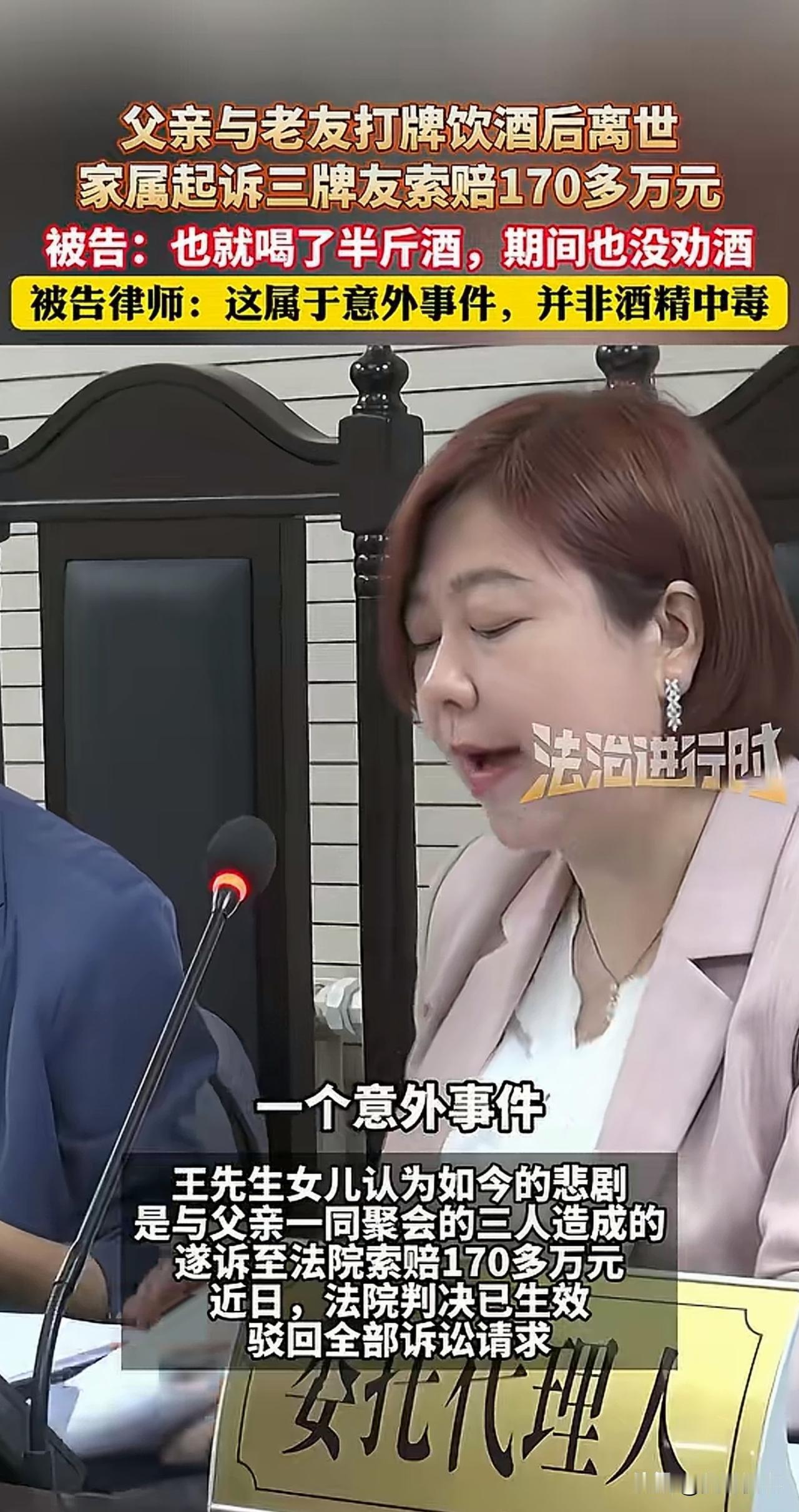 “打牌摊上事了!”北京昌平,一女子闲来无事,组了个局邀好友一起打牌。吃饭时,好友和女子的丈夫共饮了半斤白酒。谁料饭后,好友感觉身体不适,女子夫妇见其半天都没缓过劲儿,赶忙拨打120急救,可好友最终还是抢救无效死亡。 事后,好友的女儿觉得,牌友送医不及时是父亲死亡的根本原因,便将当天同桌的3名牌友一同告上法院,索赔170万元。对于此事,法院这样判了。 事情是这样的,王先生和马女士一家是三十多年的铁杆好友,退休后,他们更是经常聚在一起打牌聊天,感情堪比家人。 事发当时,马女士又约王先生来家做客,几人打牌尽兴后,王先生留在马女士家吃饭。 席间,马女士的丈夫还和王先生小酌了几杯,两人大约喝了有半斤酒。 可谁曾想,饭后没多久,王先生突然说胸口发闷、喘不上气。 马女士一家给王先生安排地方躺下,以为他就是喝了点酒没缓过来,想着歇会儿就好。 可眼看王先生脸色越来越差,始终没见好转,马女士夫妇便赶紧拨打120急救电话。 然而,遗憾的是,经过抢救,王先生还是不幸离世 紧接着,王先生的女儿将马女士夫妇及另一牌友告上法院,张口索赔170万元! 王先生的女儿认为,父亲出现不适后,马女士等人足足耽误了一个小时才叫救护车,正是这关键一小时延误了救治,才导致父亲没抢救过来。所以,他们三人理应为此负责。 而面对对方的起诉,马女士更是哭着喊道:“我们认识三十多年,比亲人还亲,怎么会眼睁睁看着他出事?当时真以为他喝了点酒头晕,谁能想到是这么严重的病啊!” 诚然,无论是马女士还是王先生的女儿,这样的结果当然是他们都不愿看到的。 但事已至此,从法律上来看,又该如何评价此案呢? 《民法典》规定,行为人因过错造成他人损害,应承担侵权责任。 简单来说,如果要认定马女士等人对王先生的死亡结果担责。王先生的女儿应当提供证据加以证明。 然而,王先生的女儿并未提供任何证据证明相关事实。 此外,经法医鉴定查明:王先生的死因也并非是酒精中毒,而是他自身潜在疾病急性发作导致,饮酒仅为偶然诱发因素,并非直接原因。 结合现场情况和证人证言,法院认定这属于意外事件,马女士等人对王先生的死无故意或重大过失。 最终,法院依法驳回了王先生女儿的全部诉求。 这样的事情发生,值得每个人深思。 在这里要特别提醒大家: 1、成年人需对自己的身体和行为负责。 明知自己不能喝、有基础疾病的情况下,就应主动拒绝饮酒; 饮酒后,也千万别逞强开车,更别让朋友酒后驾车,这是对自己和他人负责。 2、作为同饮者,聚会喝酒图开心,但千万不要“拼酒”。 席间,要多关心他人、少劝酒;看见有人喝多了,主动将其送回家或联系家人;看到有人要酒后驾车,更要坚决拦住。 总之,朋友相聚本是美事,但“酒文化”绝不能凌驾于安全之上。 喝酒有度,责任在心,别让一场聚会变成无法挽回的遗憾。 对此,你怎么看?欢迎大家在评论区留言。