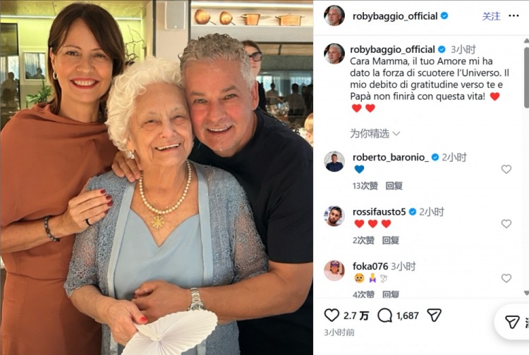 通过这段话,罗伯托·巴乔宣布了母亲马蒂尔德去世的消息。他发布了一张与母亲的合影,并配上了这段令人动容的文字。目前他已收到数以千计的慰问,社交媒体上到处都是发给这位足坛巨星的贴文。