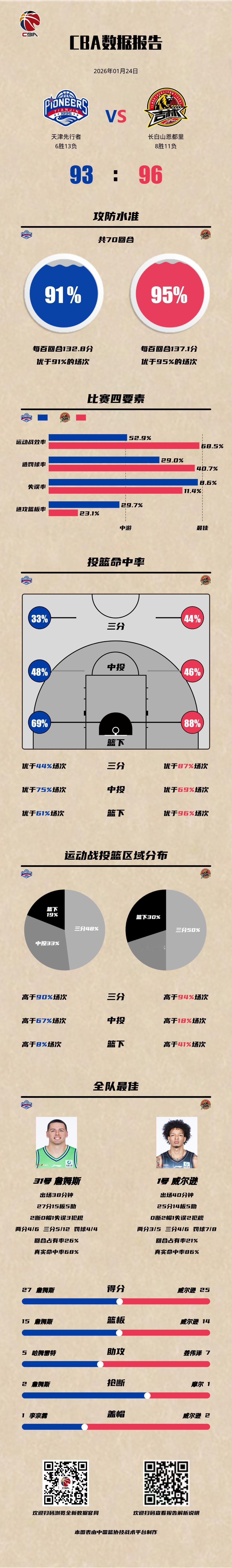 天津先行者 93-96 长白山恩都里天津男篮vs吉林男篮 天津先行者:詹姆斯27分15篮板5助攻2抢断,哈姆雷特22分5助攻,林庭谦19分4篮板; 长白山恩都里:威尔逊25分14篮板5助攻2盖帽,摩尔21分5助攻,栾利程14分2篮板。CBA数据库