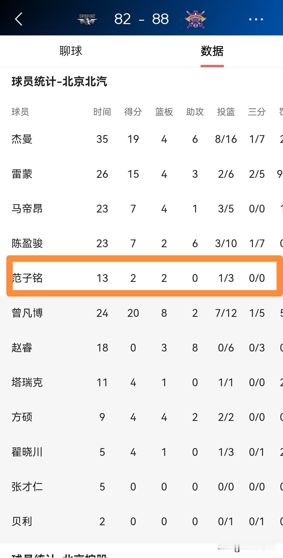 北京北汽大将范子铭真是太不稳定了!在今天北京北汽主场以82:88输给北京控股的比赛中,范子铭仅仅首发出战13分钟,投篮3中1得到2分2篮板1盖帽,他的场上正负值为-8。 虽然范子铭贵为顶薪球员,但是他在进攻端最大的问题就是缺乏稳定性,本场比赛范子铭的场下效果非常糟糕,因此他仅仅得到了13分钟的上场时间,并且在比赛的关键时刻惨遭主帅许利民的弃用。