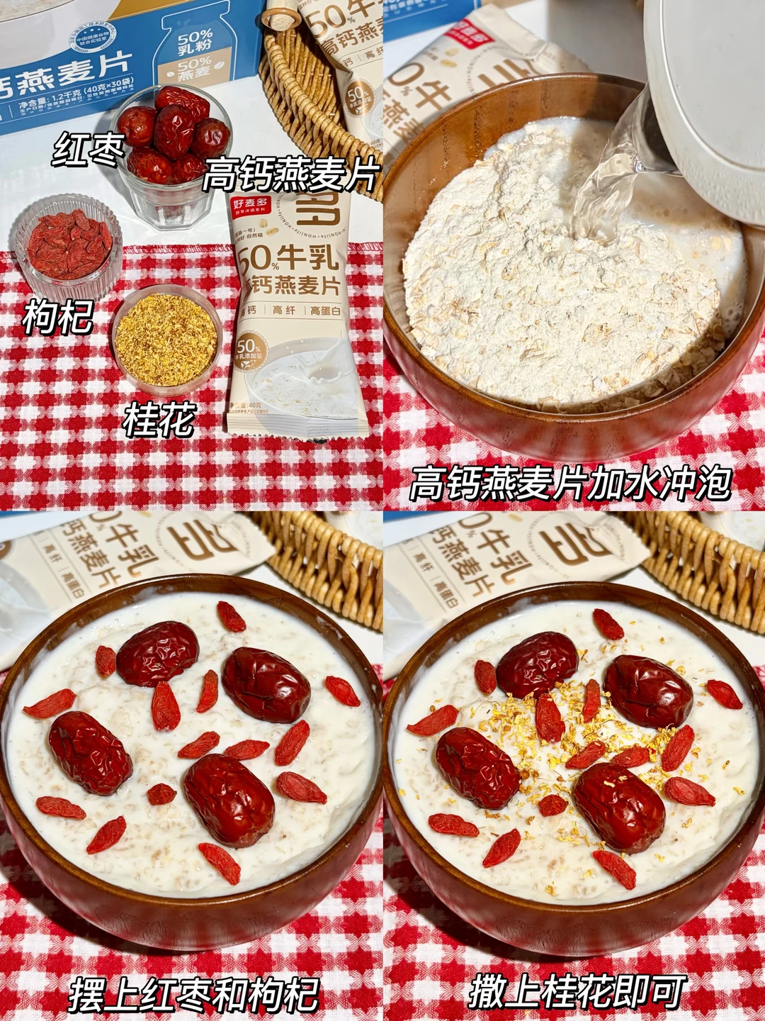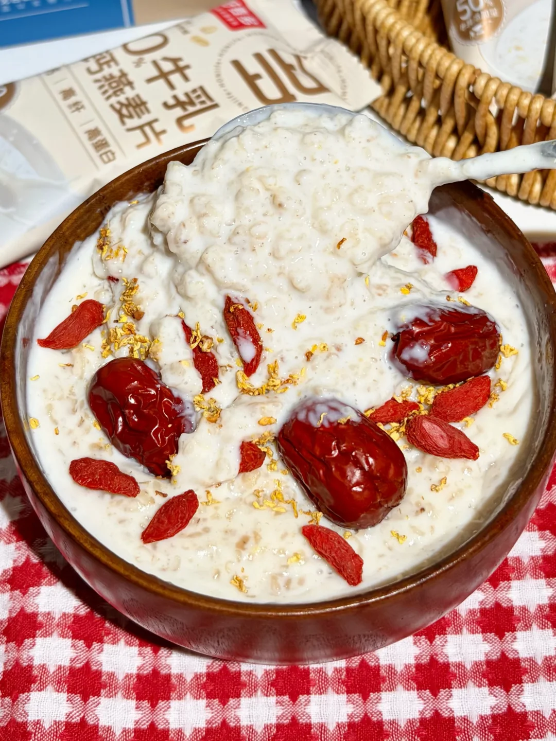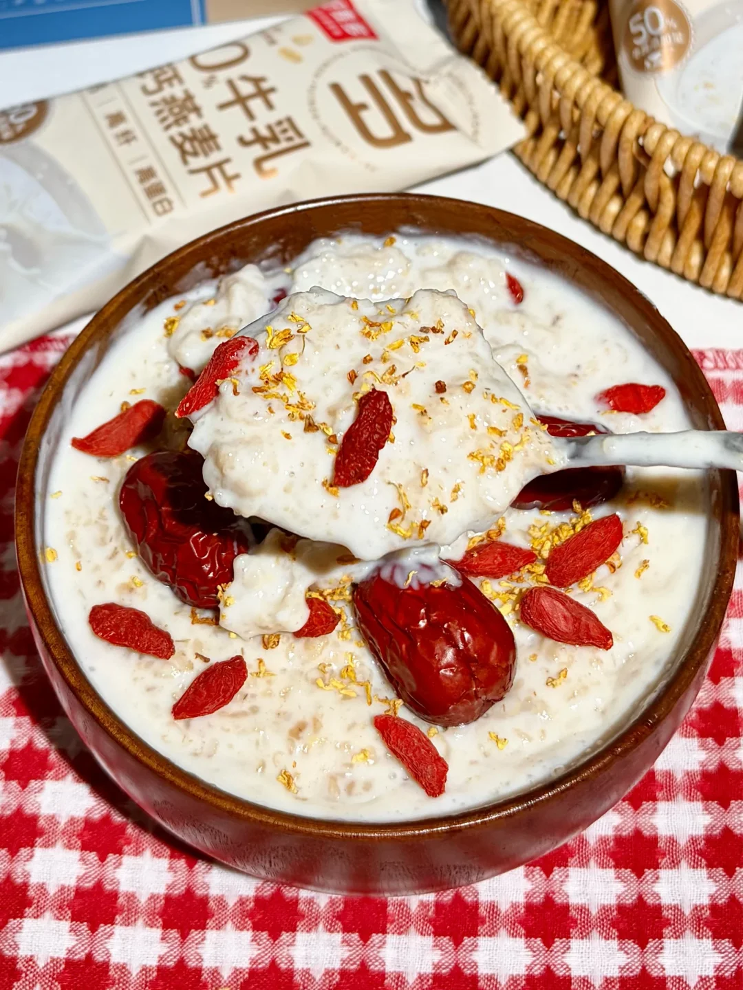 燕麦牛乳混合着红枣,枸杞桂花的香气~奶香浓郁~口味丰富!