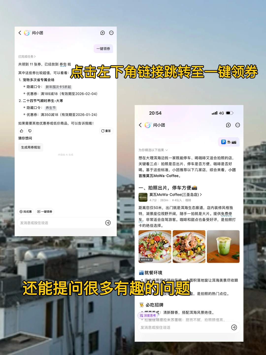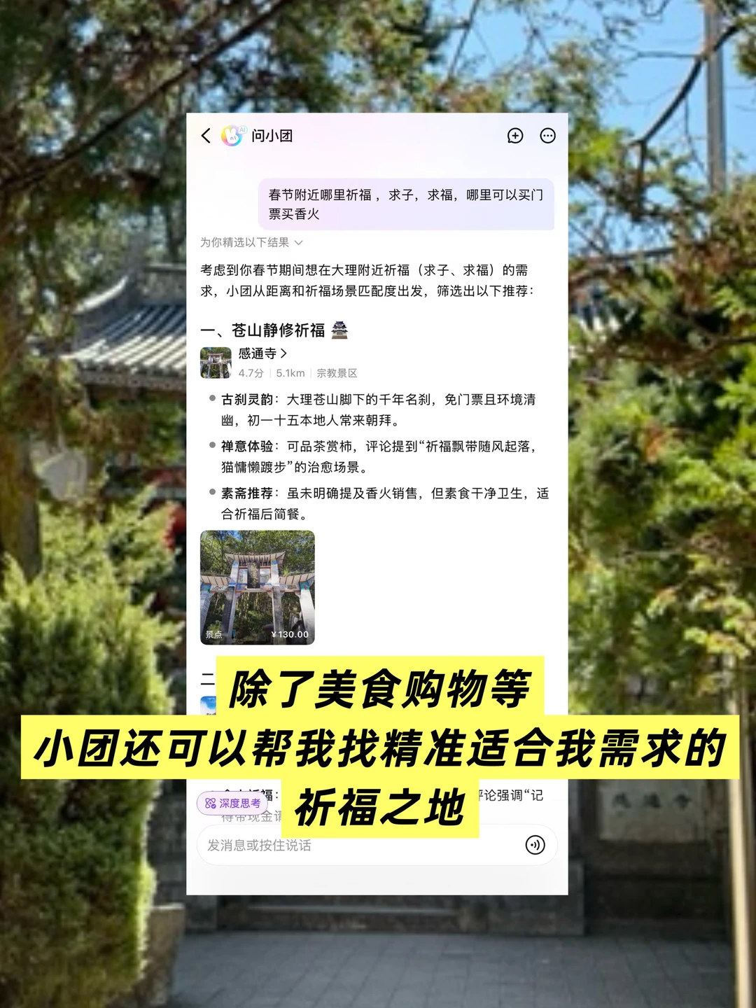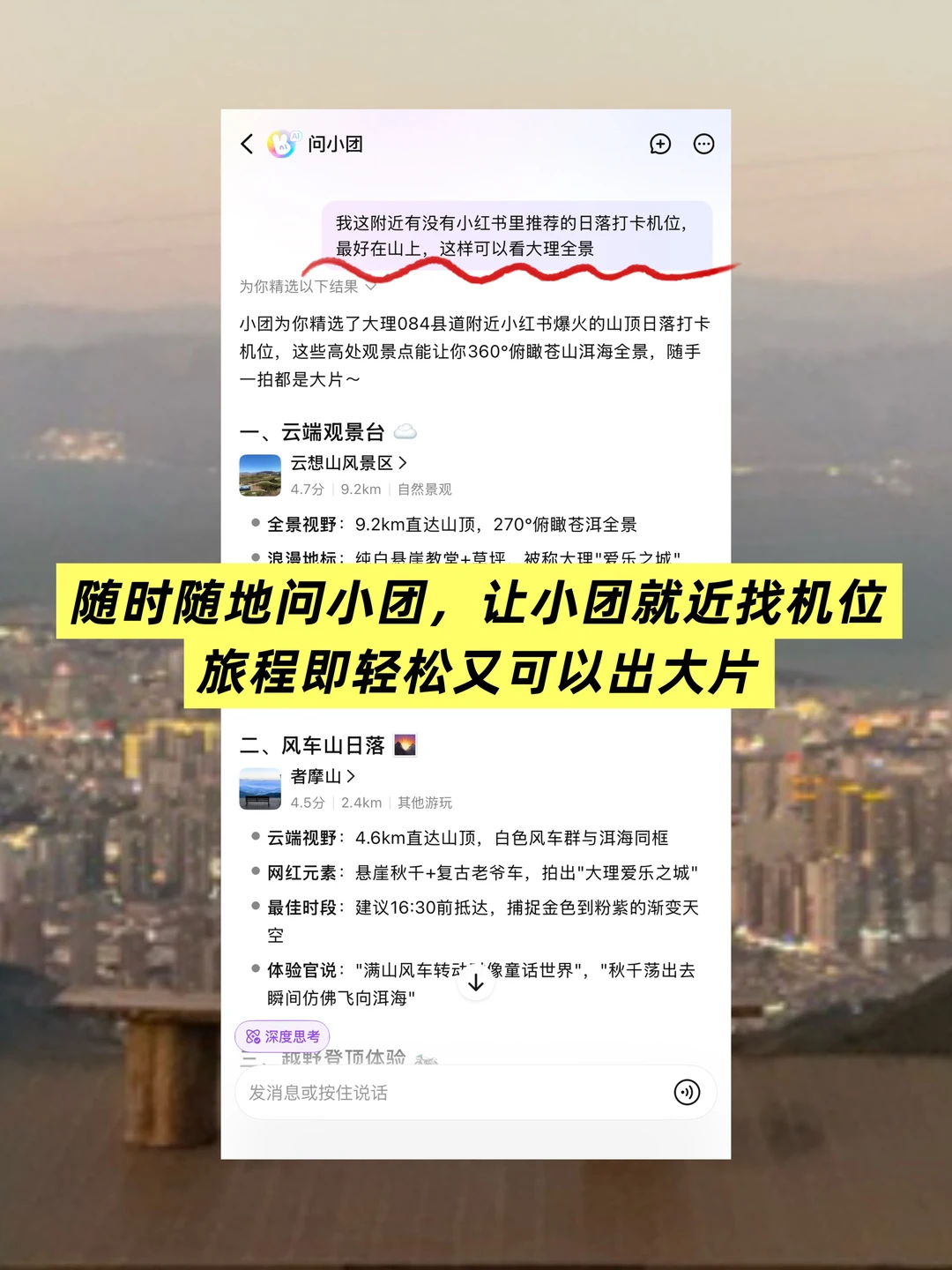 现在AI时代我们可以像与人对话那样询问,比如这个已经成为我私人秘书的“小团”,我就可以直接问它“帮我找10家大理洱海边拍照打卡最出片的咖啡店,人均50以内”