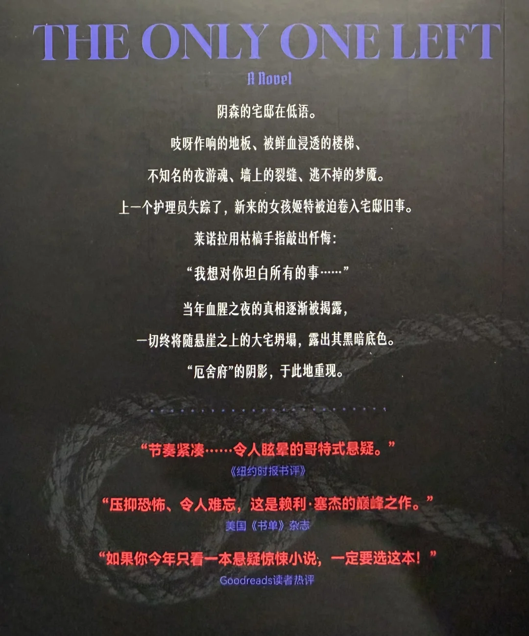 很典型的欧美悬疑惊悚小说,或者说心理恐怖,典型到只要看一眼简介,就能瞬间让你忆起那个充满各类哥特元素的古典时代:僻居一隅的城堡(古宅),荒芜的悬崖海岸与翻涌不绝的波涛,脾气怪异阴沉的管家,各怀心事(秘密)的工作人员,初来乍到、不明就里的女佣(护理员),藏着骇人真相的过往悲剧……