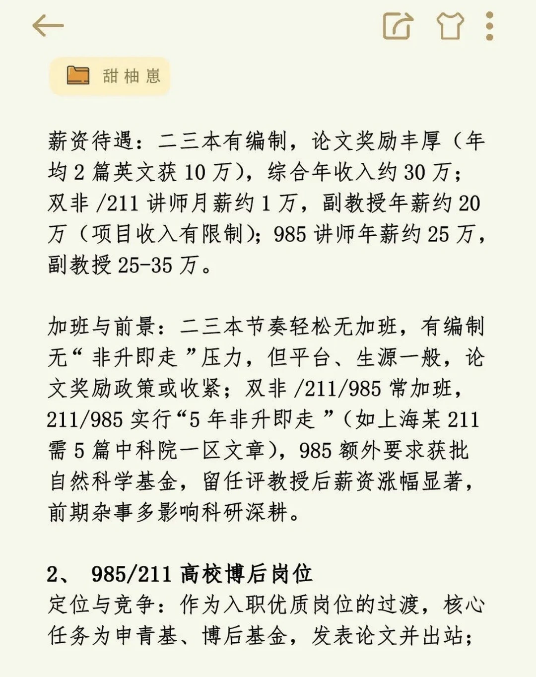 加班与前景:二三本节奏轻松无加班,有编制无“非升即走”压力,但平台、生源一般,论文奖励政策或收紧;双非/211/985 常加班,211/985 实行“5 年非升即走”(如上海某 211