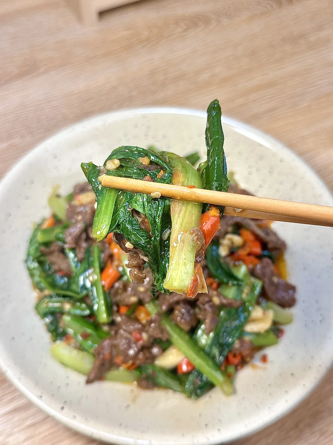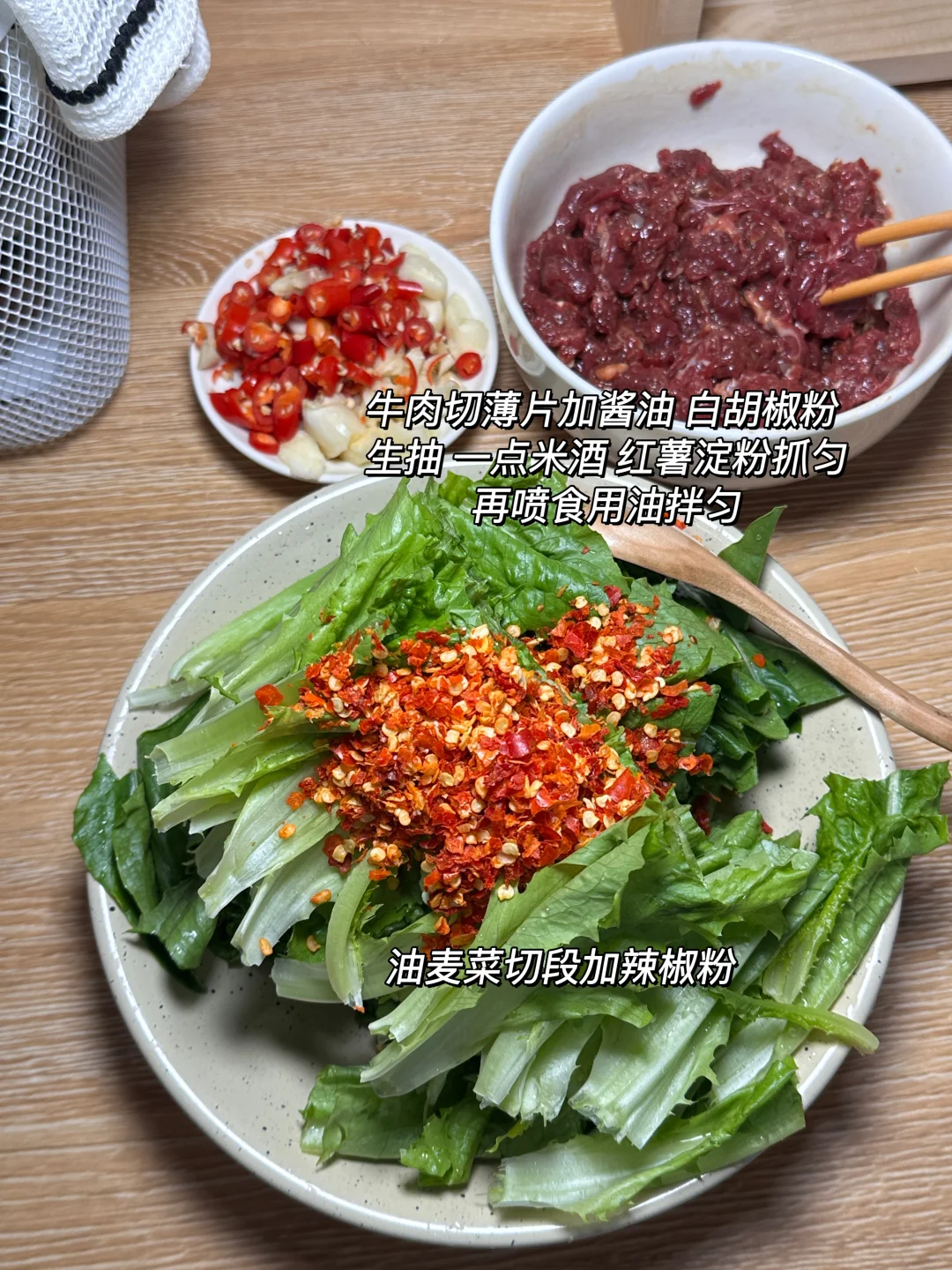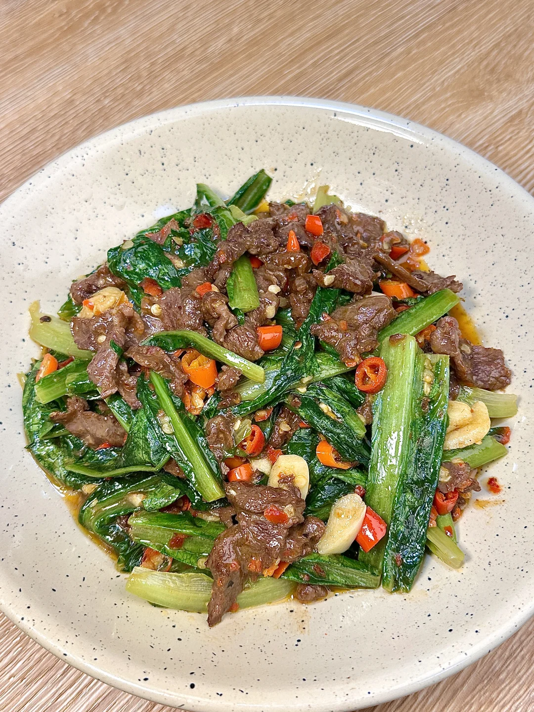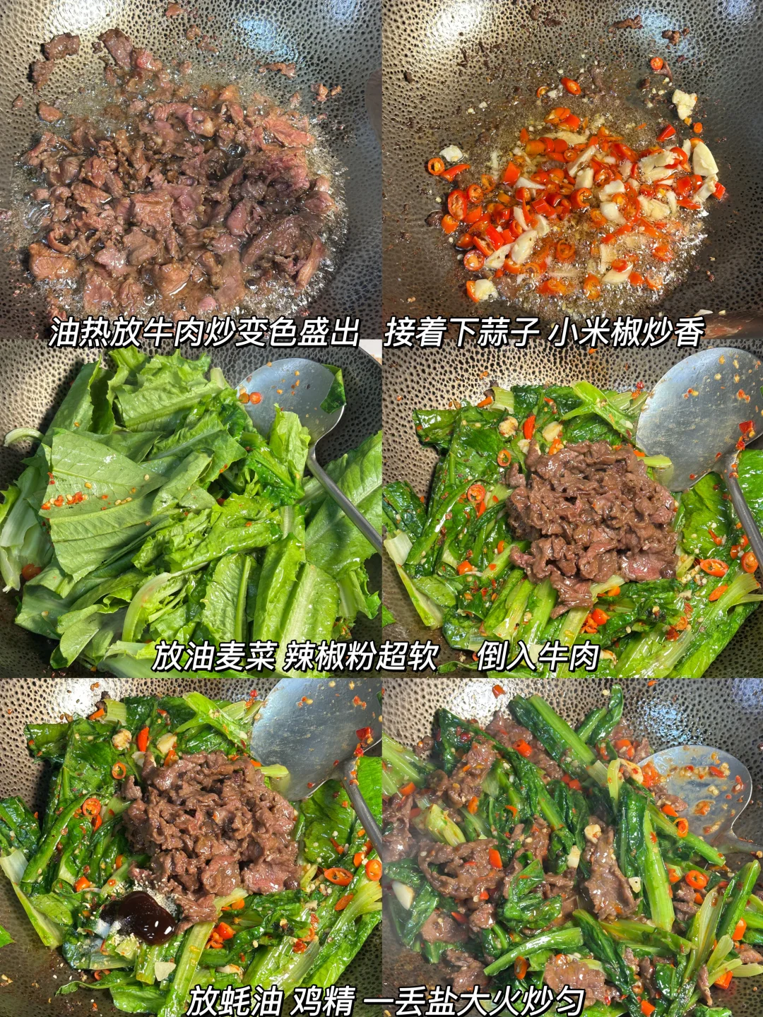 利村牛肉 朋友每次来家里必不可少的菜[偷笑R]牛肉鲜辣嫩滑,油麦菜脆爽带点微甜,一定要试试!! ✨食材:牛肉 油麦菜 蒜 小米椒 辣椒粉 1️⃣:锅里油热后放入牛肉,快速翻炒至变色,盛出备用,用锅里剩下的油,放入蒜子和小米椒炒出香味。放油麦菜和辣椒粉,大火炒到菜叶变软。 2️⃣:.把炒好的牛肉倒回锅里,加入蚝油、鸡精和少许盐,大火快速炒匀。