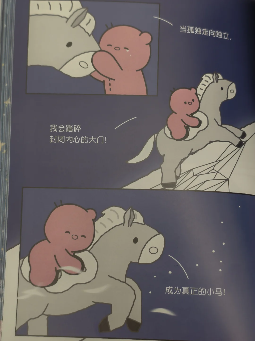 这抹蓝让我想起《两个天才》里“给太阳装灯泡”的荒诞,但更接近《小星星的大月饼》的温柔。它似乎在告诉我们,思念不该是沉重的深蓝,而是带着童话滤镜的湛蓝。当指尖划过书页边缘,就像摩挲着银河的脊梁,连翻书都成了浪漫的星际航行。