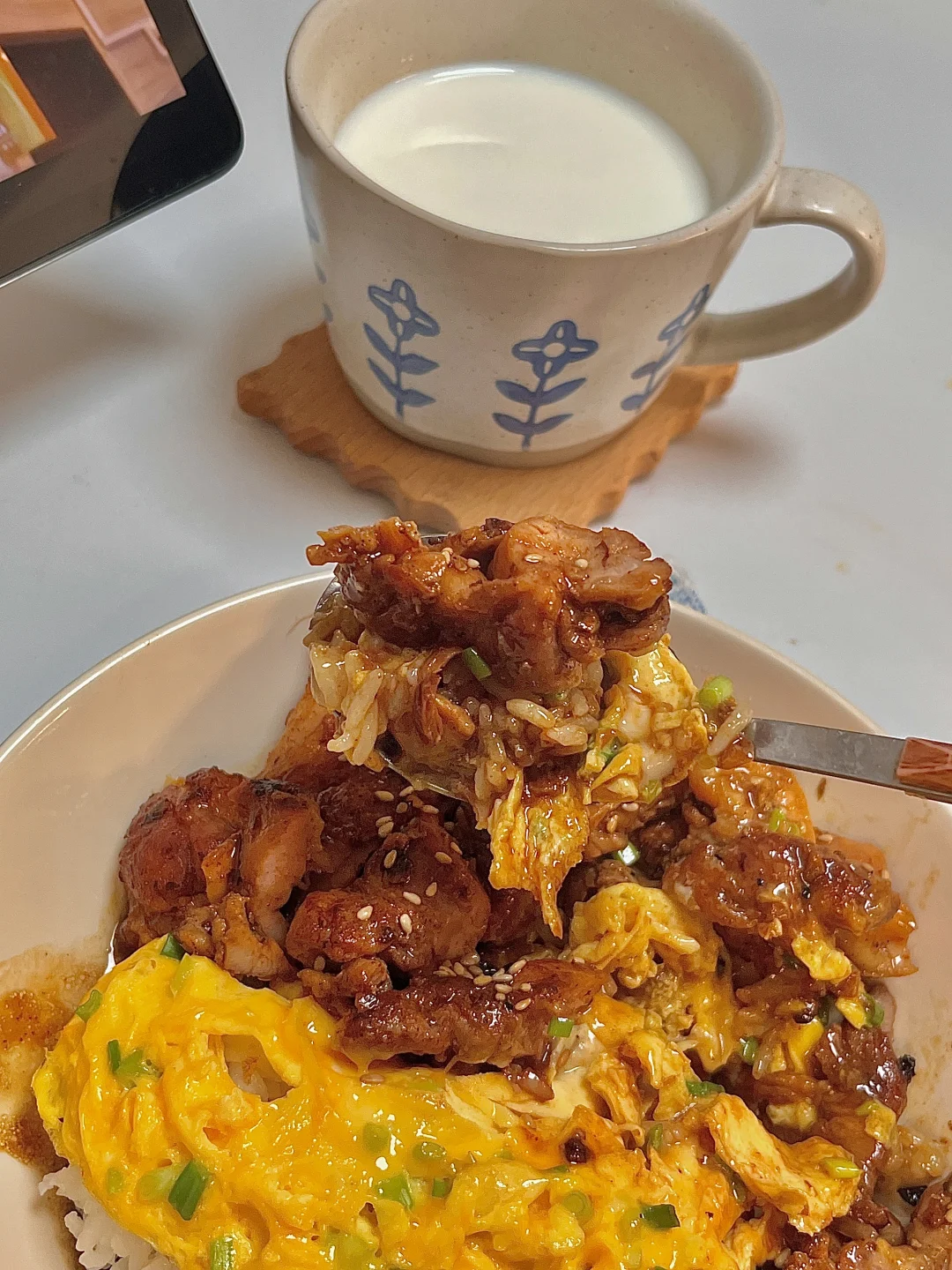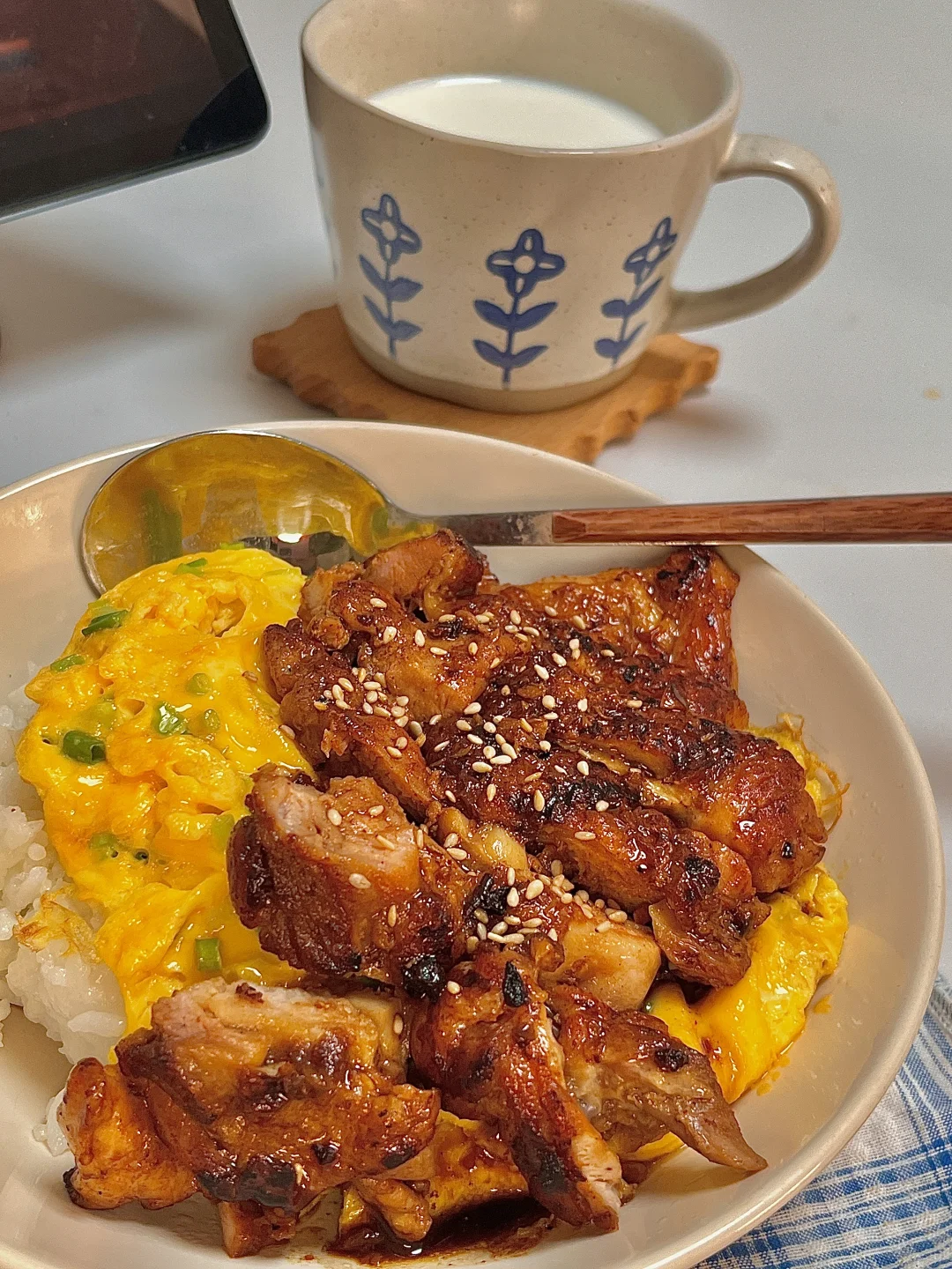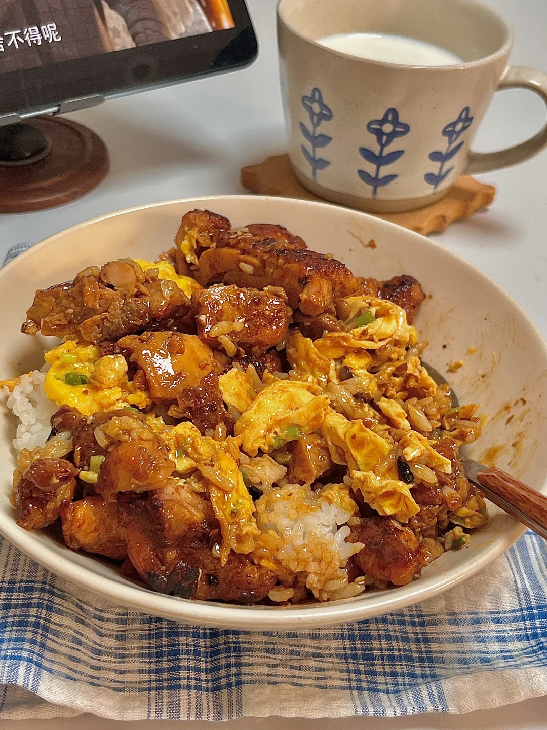 吃商开悟大赛 今日份一人食: 照烧鸡腿肉 滑蛋 牛奶 . 色香味俱全的照烧鸡腿滑蛋饭🍚谁吃了不迷糊呀!真巨好吃😋鸡腿肉入味又多汁,嫩嫩的滑蛋,浓郁的小酱汁拌米饭🍚一口大满足~ 爱吃的宝一定要去试试呀✌🏻