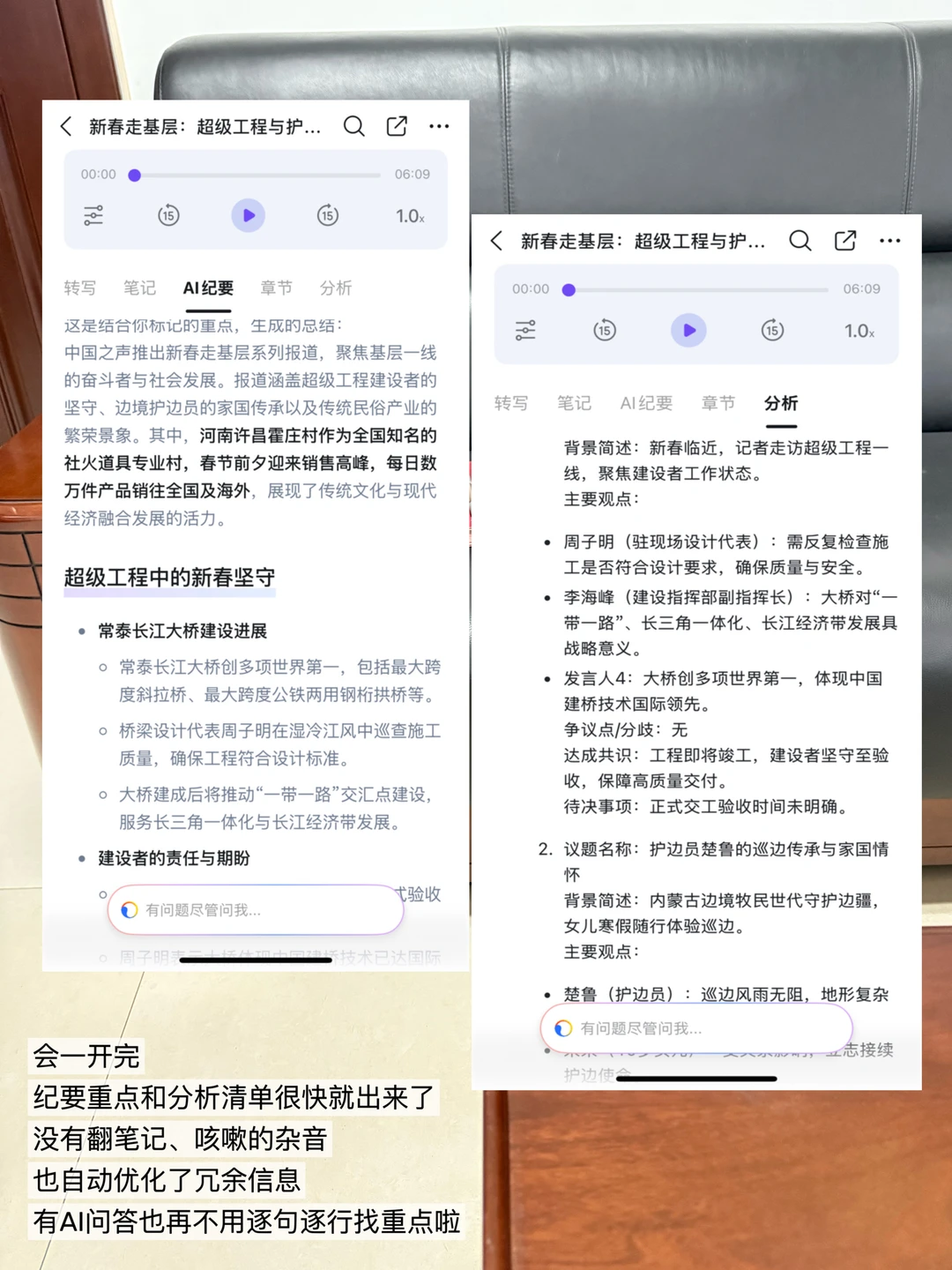 会一开完,纪要重点和待办清单很快出来了,没有翻笔记、咳嗽杂音,也自动过滤冗余信息[清单R]有AI问答也不用逐句找重点啦。最棒的是,它让我从记录员回归到参与者,省下的时间心力用来思考,即兴表达都进步了。