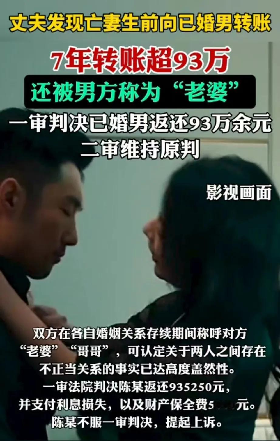 太揪心了!浙江宁波,一男子在为亡妻整理遗物时意外发现,妻子生前曾与一陌生男子交往密切,妻子8年间给对方转账935250元。男子找到对方要求归还财产,在遭到拒绝后,男子将陌生男子告上法庭,要求对方全额返还并支付利息,陌生男子解说:“我们就是生意上合作的伙伴,她转给我的钱分红!”法院判了! 爱人走了本就够难熬,整理遗物时还撞见这么一档子事,换谁都顶不住。 陈大哥先是翻出项大姐常用的旧手机,想着把里面的照片、视频导出来存好,留个念想。 解锁手机后,他顺手点开了微信和支付宝,想看看里面有没有没结清的账单,结果越看越不对劲。 一开始陈大哥没太在意,想着可能是亲戚朋友借周转,可越往后翻,心里越沉。 他耐着性子一笔一笔地算,手机屏幕越划越慢,手都有点发颤。 他从来没听项大姐提过这个男人,家里也从没和这个人有过往来,这近百万的钱,到底是怎么回事? 陈大哥拨通了对方的电话,开门见山地问起转账的事,希望对方能给个说法。 电话那头的陈某一开始语气还挺客气,可当陈大哥说要他把钱还回来时,态度立马就变了,语气也硬了起来。 “我跟你老婆一起做了好几年生意,赚了钱她给我分点,这不是很正常吗?” 陈某的话让陈大哥火冒三丈,他当即反驳,家里从来没提过什么合作生意,也没见过任何收益,要是真有合作,怎么连个合同、账本都没有? 被挂了电话的陈大哥又气又急,他不甘心就这么算了,又仔细翻遍了项大姐的所有遗物,衣柜里的衣服、抽屉里的文件、家里的保险柜,但凡能藏东西的地方都找了个遍,可连一张和所谓“合作”相关的纸都没找到。 更可疑的是,项大姐手机里和陈某的聊天记录,大部分都被删除了,只剩下寥寥几条无关痛痒的消息。 陈大哥不死心,找了懂技术的朋友帮忙,试着恢复手机里的删除记录。 项大姐跟陈某抱怨家里的琐事,会分享自己的心情,陈某也会陪着她闲聊,还时不时说些情话,完全就是情侣之间的相处模式。 更关键的是,从头到尾的聊天记录里,没有一个字提到过生意合作、投资项目,也没有说过分红的具体事宜,全是些儿女情长的家常话。 有一次项大姐跟陈某说自己不舒服,陈某还特意叮嘱她去医院检查,语气里的关心溢于言表,这哪里是什么生意伙伴,分明就是不正当的男女关系。 拿着恢复的聊天记录和完整的转账清单,陈大哥再次联系陈某,可陈某还是死不认账,说那些聊天记录是断章取义,不能作数,甚至还反过来指责陈大哥侵犯隐私。 协商来协商去,陈某始终不肯退钱,陈大哥实在没办法,只能拿起法律武器维权。 当法官追问具体做什么生意、投资多少、怎么分红时,这个证人却支支吾吾说不上来,只说自己不清楚细节,只是偶然听到一句。 陈大哥的律师当场反驳,仅凭一句模糊的听闻,根本证明不了存在真实的合作关系。 反观转账记录,项大姐八年里单向转了两百多笔钱,金额杂乱还带着特殊含义。 正常的合作分红,要么有固定的时间周期,要么有明确的金额约定,双方账目往来也会清晰明了,哪有一方持续大额转钱,另一方几乎不回流的道理? 法院经过详细审理,也理清了其中的关键。 陈大哥和项大姐1996年就结婚了,婚内也没约定财产分开所有,所以这些转账的钱,都属于夫妻共同财产,项大姐没经过陈大哥同意,就擅自把钱转给别人,本身就侵犯了陈大哥的财产权。 再结合恢复的聊天记录和转账细节,足以认定项大姐和陈某之间存在不正当关系,项大姐的转账行为,本质上就是无偿赠与。 陈某明知项大姐已婚,还接受这样的赠与,同样不合情理,理应把钱全部返还。 陈某不服一审判决,又提起了上诉,还质疑聊天记录是伪造的,可他拿不出任何证据证明自己的说法,也没法说清所谓“合作项目”的具体情况,上诉请求自然被驳回了。 对于这件事,您有什么想说的吗?欢迎评论区留言讨论。