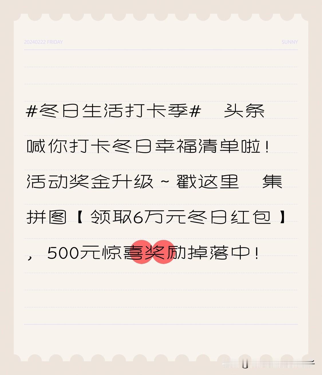 头条的“冬日生活打卡季”活动太诱人啦!奖金升级不说,集拼图还能领6万元冬日红包,还有500元惊喜奖励随机掉落。 参加活动也不难,在今日头条APP,点“我的-创作首页-发布-创作活动”,里面有超多活动任你选;电脑版是“头像-创作平台-成长指南-创作灵感-创作活动”。要是用今日头条极速版,就“打开软件-点击我的-创作首页-展开-创作活动-参与活动-立即投稿”。 不过很多活动有要求,像带特定话题、发够篇数、阅读量达标等,参加前一定要看清。我上次就拿了1.4元活动奖金,说不定这收益比创作收益还高,大家赶紧冲!
