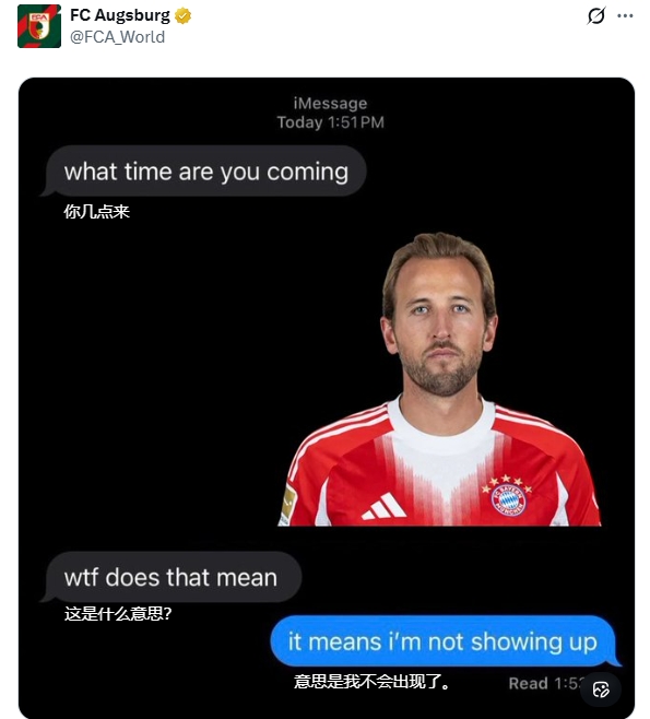赛后,奥格斯堡英语官推晒照调侃凯恩本场无表现。