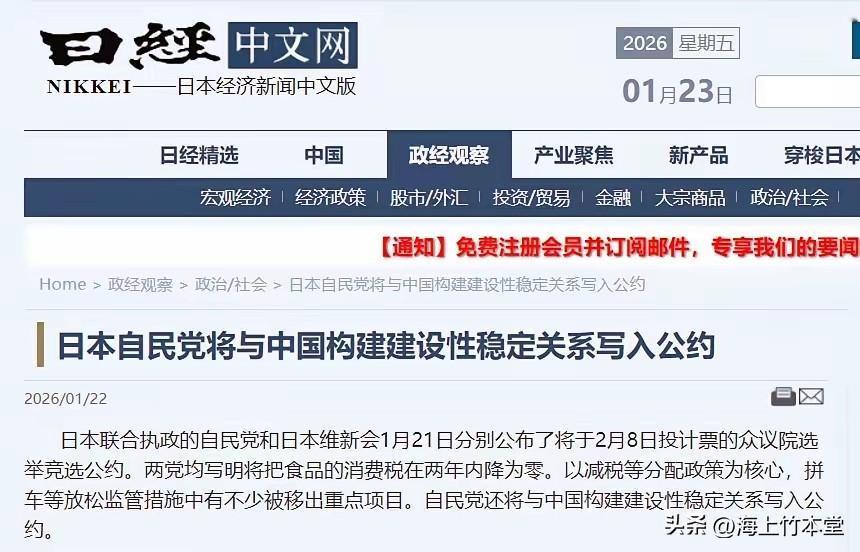 日本:终于明白了特朗普的意思 日本政坛这一波“高市早苗阴风”刮过,让躲在阴沟里八十年的军国主义抬头了。高市早苗的确不缺少政客的勇气和执着,唯一缺少的还是对当前国际风云的见识。她急着利用日本国会审查咨询政府预算的时间窗口,执意16天就做个大选,根本不顾日本当下酷寒的天气和美国的态度,因此,日本自民党不得不在声言对她支持的同时,也为党找退路。自民党破天荒发表了一个“公约”,“和中国建立建设性合作关系”赫然上了公约了。要知道,高市早苗政府最大的麻烦就是搞砸了中日关系! 外界解读为,自民党当然嗅到了美国的对华“缓和”和对高市早苗搞砸中日关系的不满。对比美国财长贝森特在达沃斯论坛上公开和日本在对华政策上切割,他就明确说,日本和中国的麻烦,没有影响到中美关系。在对比美国总统特朗普对加拿大主动改善中加关系的激烈反应,特朗普网络平台的帖子满是感叹号和大写字母,“CHINA WILL EAT CANADA IN ONE YEAR!”(中国将在一年内吃掉加拿大!)“CANADA IS A TRAITOR!”(加拿大是叛徒!)说明他多么在乎加拿大对中国的态度啊!难怪有日本学者感慨,美国人这是觉得日本无足轻重,而加拿大才值得关注呢!