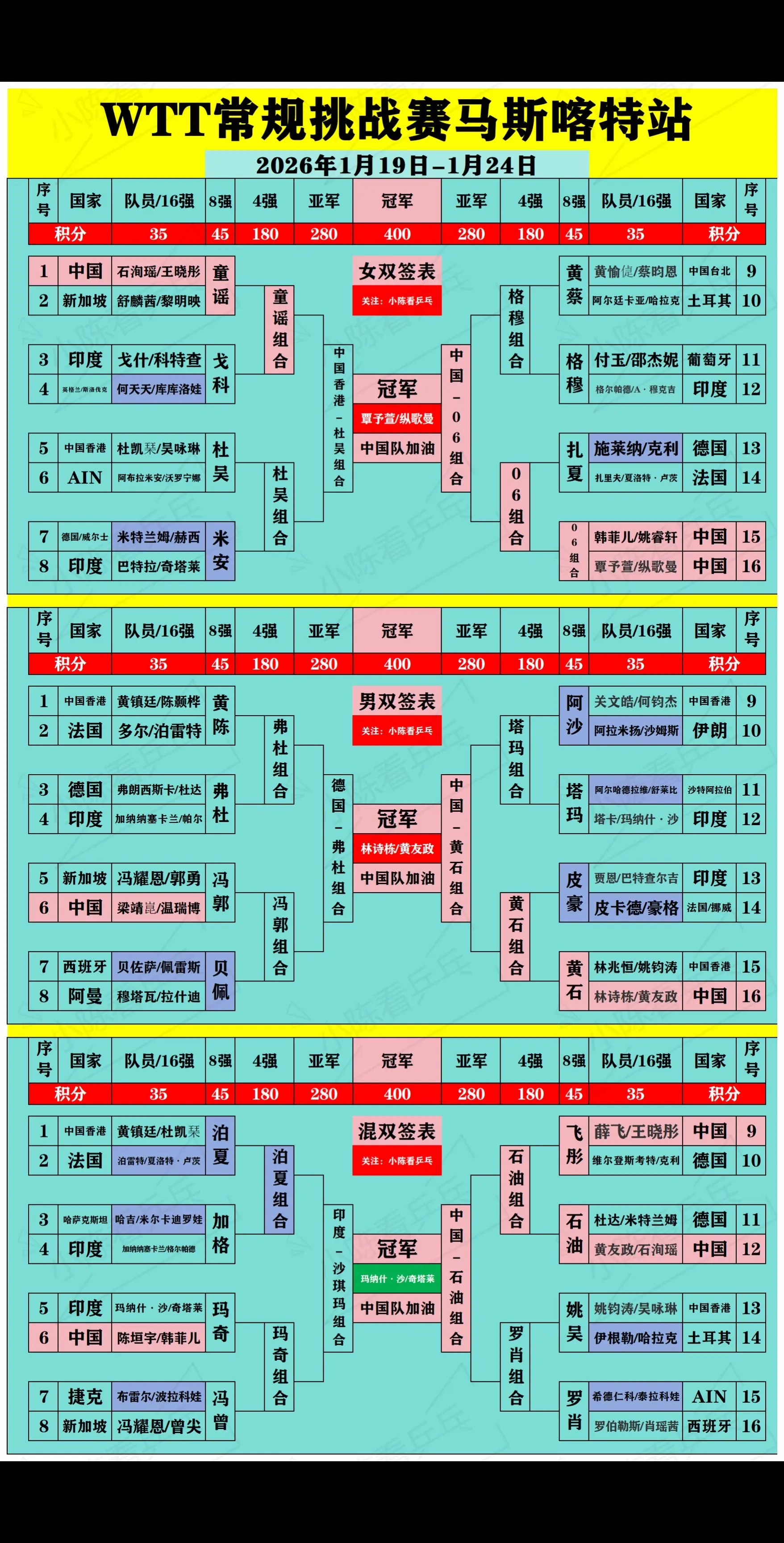 WTT马斯喀特常规挑战赛落幕完整签位图。WTT马斯喀特常规挑战赛落幕完整签位图,恭喜中国队获得4冠2亚的成绩,中国队下一站继续加油。
