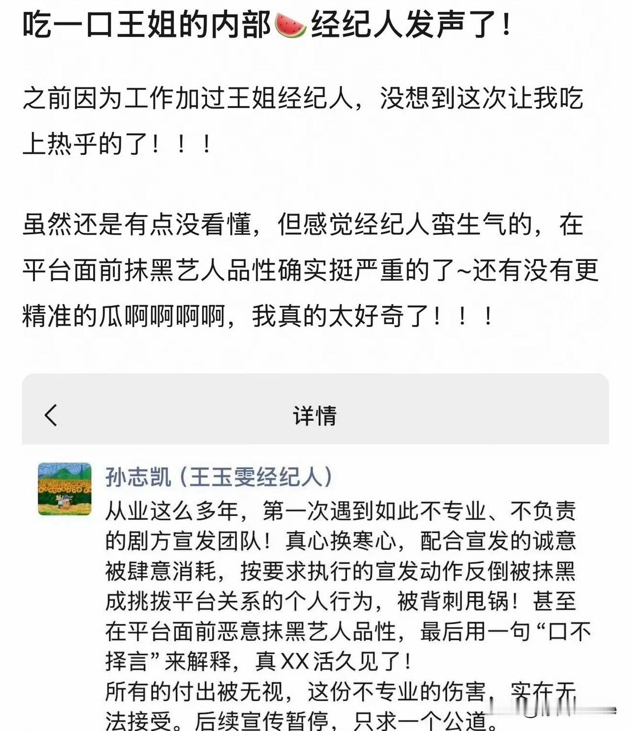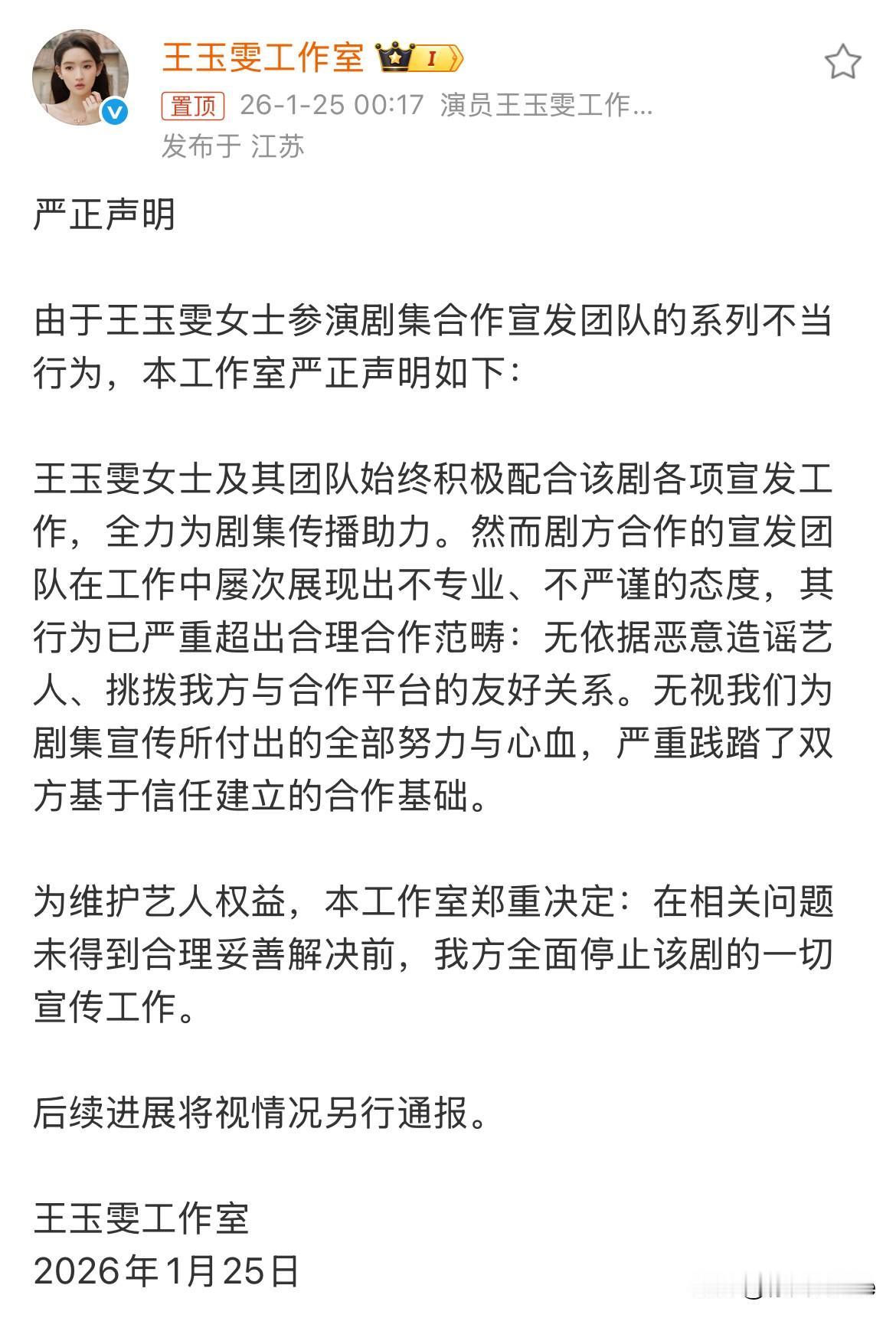 1月25日,王玉雯工作室发文,宣布全面停止《突然的喜欢》这部剧的一切宣传工作 原因是剧方合作的宣发团队无端恶意造谣王玉雯,在线指控宣发团队三大违规行为! 第一,王玉雯违反剧宣期发帖不超过3条,谎称剧宣物料是王玉雯自行策划,导致🧣跟👖向王玉雯团队问责 第二,诬陷王玉雯故意挑拨🧣👖关系,破坏王玉雯工作室与🧣👖的信任基础 第三,王玉雯团队很努力剧宣,但宣发团队长期态度不专业,严重践踏双方合作基础 总结下来其实就是王玉雯跟剧方之间的问题,剧方合作的宣发团队到底还是听剧方的安排,剧方后面承认宣发团队存在“无依据造谣艺人”问题,宣布开除涉事人员、终止合作,并承诺整改宣发流程,还是得剧方出手 王玉雯这也是没办法不得不把这事挑明,不得罪剧方,她就得得罪🧣跟👖……