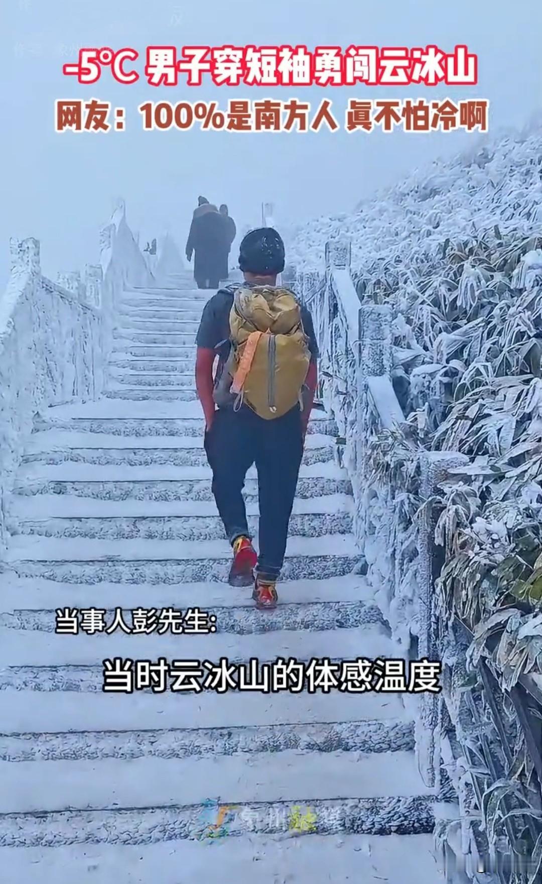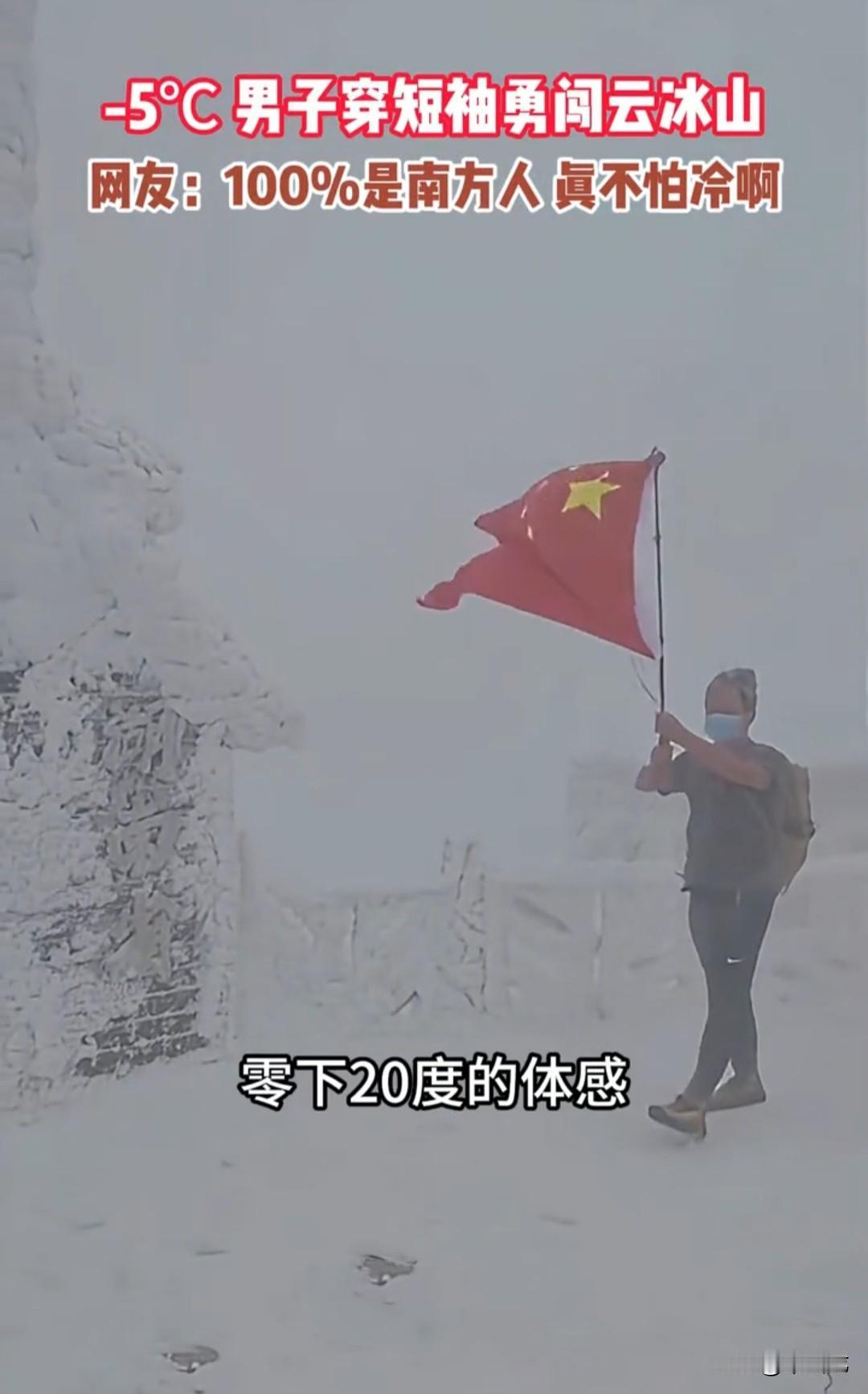 男子穿着夏季短衫,勇闯大雪纷飞的云冰山。 当时云冰山上银装素裹,到处冰雕玉琢,天气预报显示零下5度,还伴随着猛烈的大风,体感可能接近零下20度。 在这种恶劣的情况下,竟然有名男子只穿着夏季短衫,双手插兜,大摇大摆地走上山来,而其他游客都是羽绒服、厚棉衣,防寒帽,全身上下裹得严严实实。 这种强烈的反差,让人看得瞠目结舌。 其他人问他不冷吗,男子说他一年四季都穿成这样,不管去哪里都是一件短衫,因为经常运动锻炼,并接受耐寒训练,已经习惯了,所以不会感到寒冷。 虽然他说不会冷,但身体诚实地暴露了他的真实感受。 手臂都通红了,这是被冻伤了吧,还说不冷。 鸭子死了嘴巴硬,说的就是这种情况。 家里冰箱冷冻室的温度约为零下18度,想象一下,不采取任何保护措施,直接进入冷库是种什么感觉? 这是肉身凡胎,不是大罗金身。 人是不可能超越生理极限的,为了面子强行说不冷,以后老了头痛脚痛,常年卧病在床,你才会后悔年轻时的孟浪。