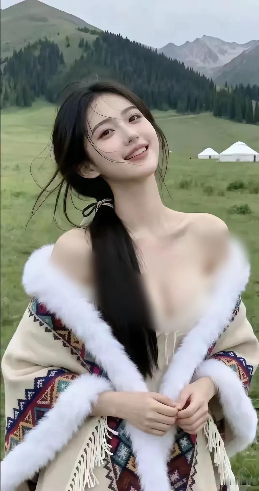 风掠过草原,裹着羊毛披肩的暖,长发随笑意轻扬。远处的毡房与青山作伴,此刻的松弛与