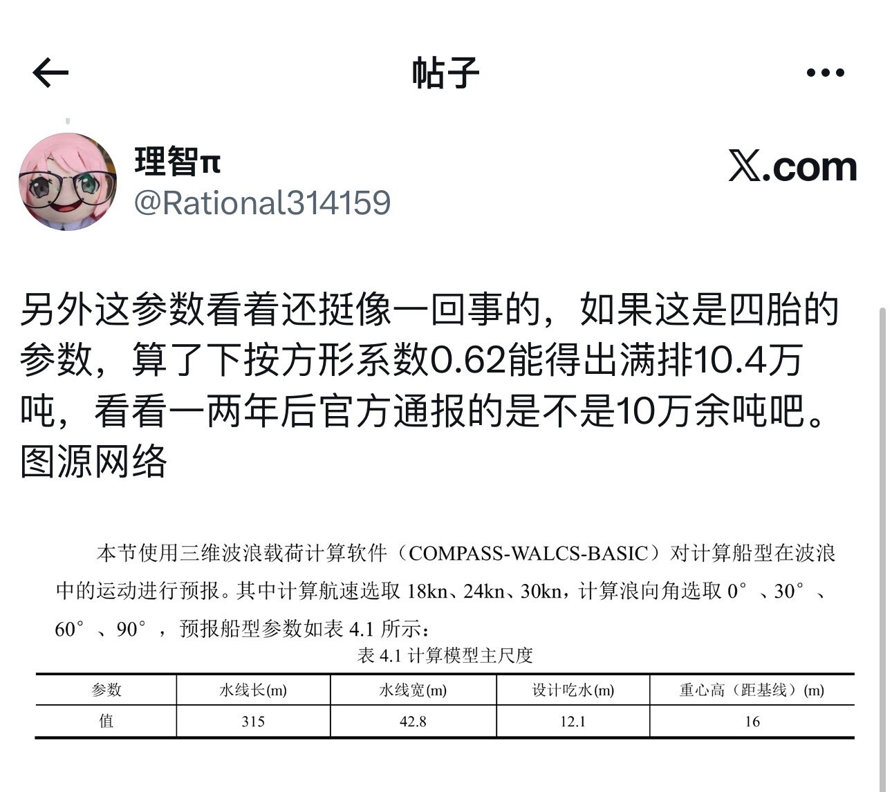 某种航母船型计算数据 水线长度315米,水线宽度42.8米,设计吃水12.1米,可计算得出在此吃水下排水量10.4万吨注意这是设计排水量,并不是满载排水量!是不是真的,过一二个月就能知道了,004水线长度卫星图非常好量 来自推特烽火问鼎计划福建舰