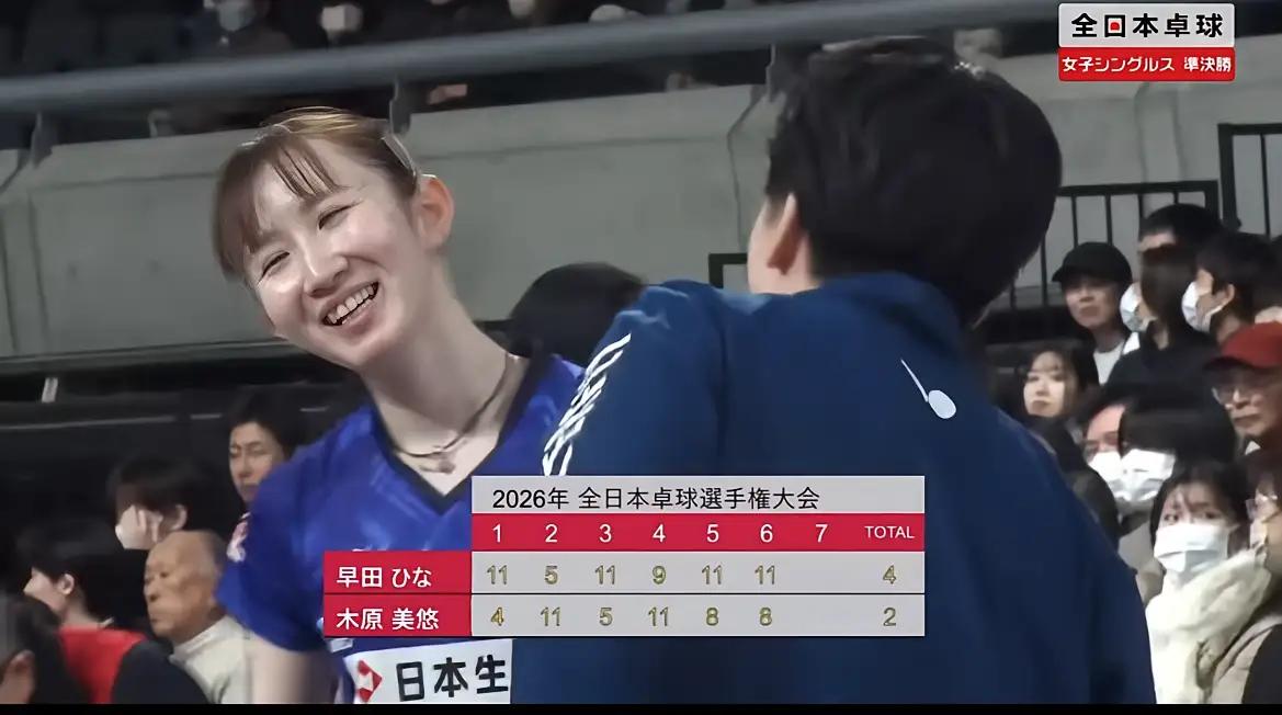 【早田希娜如愿击退木原美悠的挑战,进入卫冕位置】张本美和历经七局击败了横井咲樱进入了决赛,25岁的老对手早田希娜也没有失约,如期而至,难免一场激烈的直接碰撞。 2026年全日本乒乓球锦标赛女单半决赛,早田希娜4-2木原美悠,比分:11-4、5-11、11-5、9-11、11-8、11-8,晋级决赛与张本美和争冠。 首局,早田快热,11-4速胜,木原第二局反手提速,11-5扳平。 第三局早田11-5再领先,第四局木原关键分顶住,11-9追至2-2平。 后两局早田控节奏、抓关键分,连赢两个11-8锁定胜局。 21岁的木原美悠实力不俗,去年年底击败朱芊曦,拿了马斯喀特球星挑战赛的女单冠军。石洵瑶拿的是400分的常规挑战赛冠军,木原的是600分。 早田希娜对木原美悠长期占优,此前多次大赛包含全锦赛决赛,都击败对手,技术全面性与关键分把控更稳。 记录我的2026
