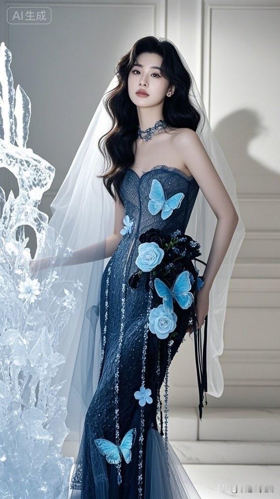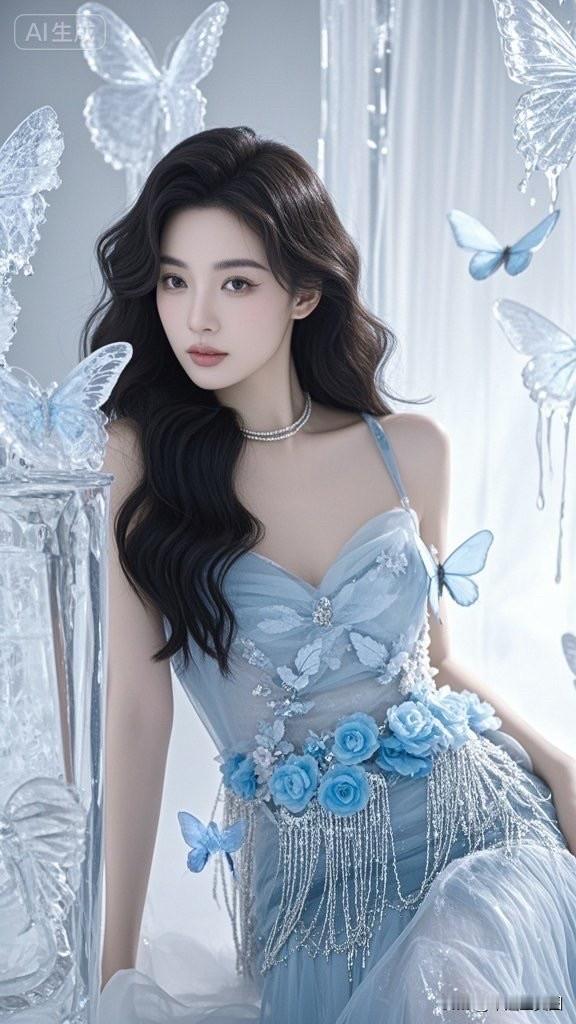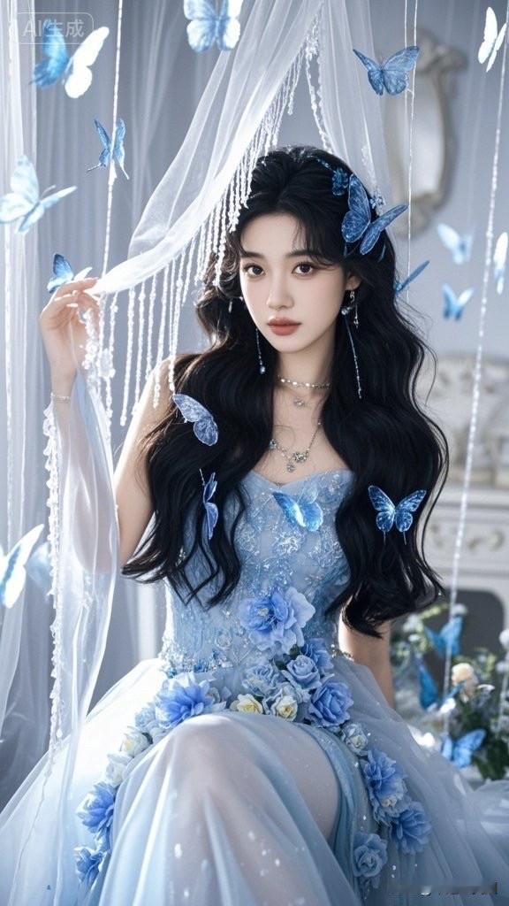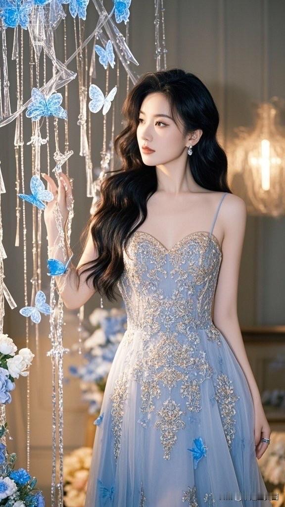 梦幻蓝裙仙女,蝴蝶环绕,唯美仙境