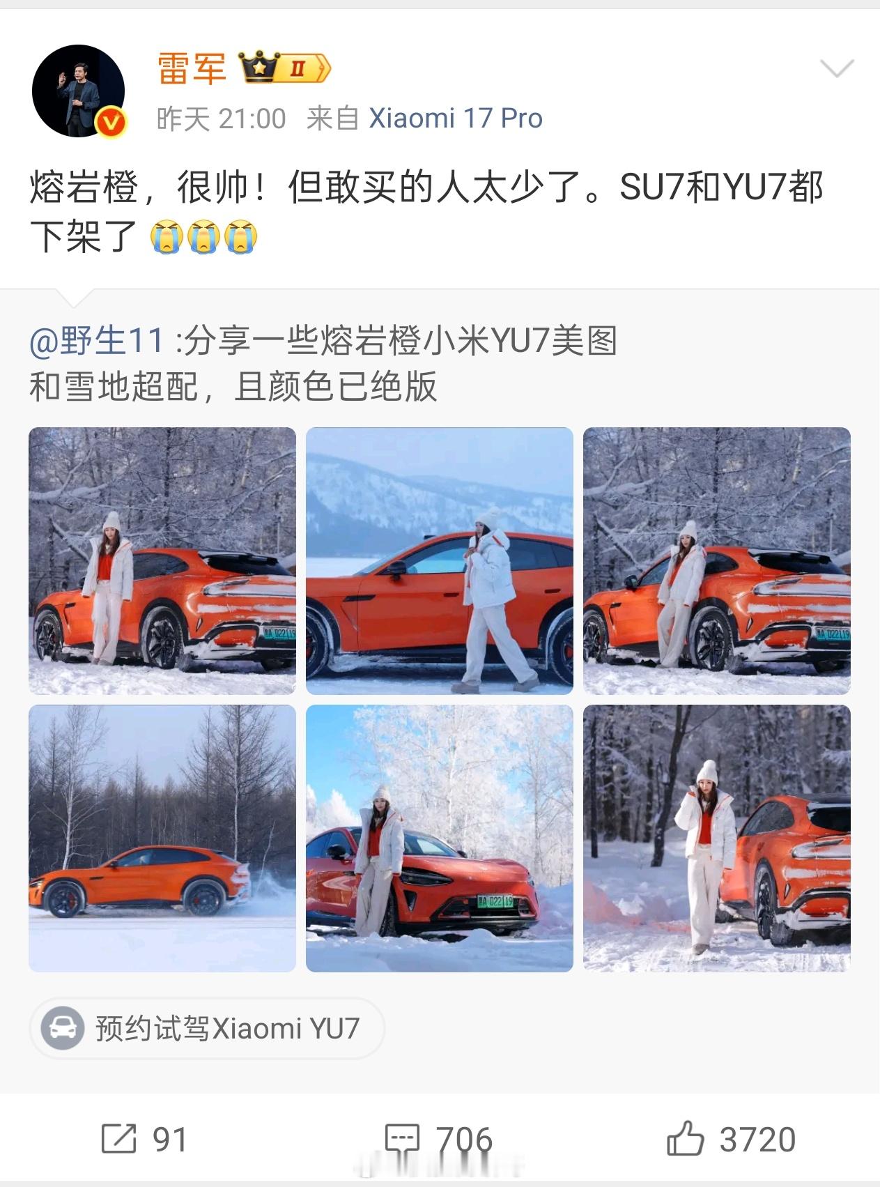雷军称小米汽车熔岩橙配色敢买的人太少 确实,因为太骚了......还有那个蓝色也很少人买,看到最多的就是银色和绿色,我只看见过一次橙色小米YU7。新能源汽车