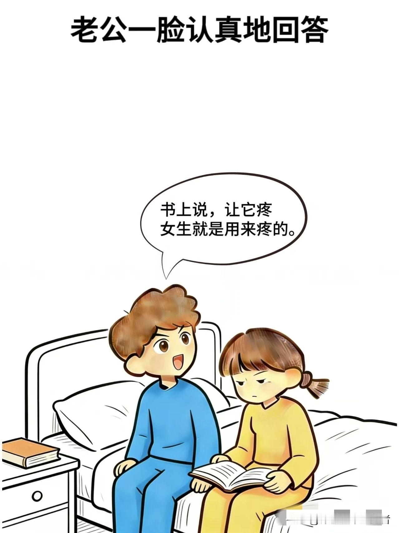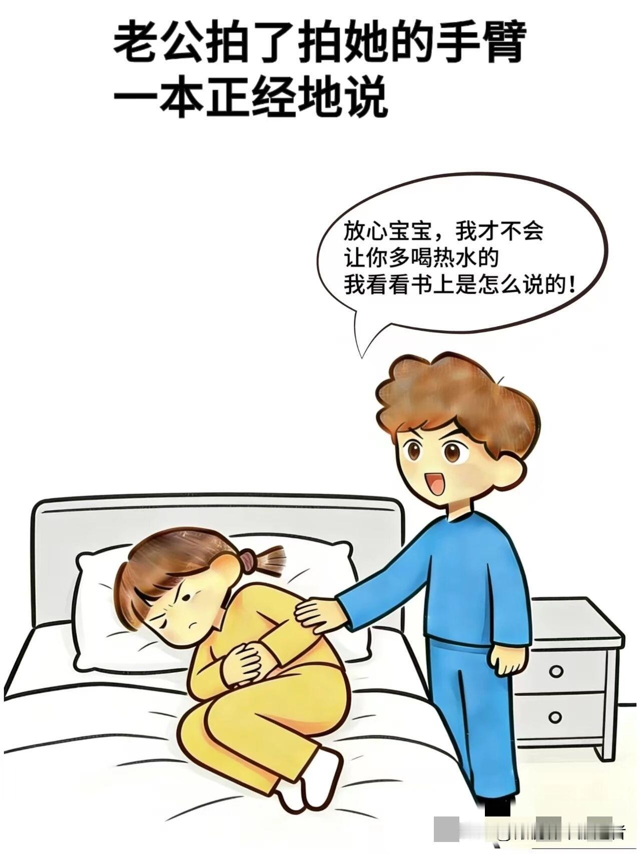 趣味漫画:老婆:肚子好疼,快安慰我一下,老公:放心宝宝,我才不会让你多喝热水的,我看看书上怎么说,老婆:书上咋说的?老公:让它疼