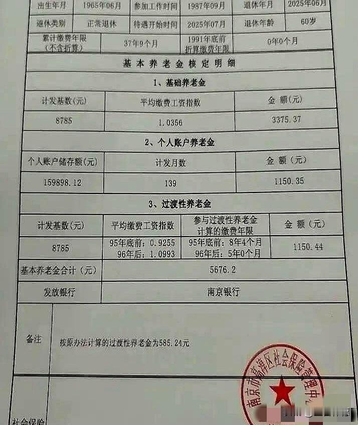 这份养老金核定表提供了一个观察江苏退休待遇的生动切片。每月5676元的养老金,若