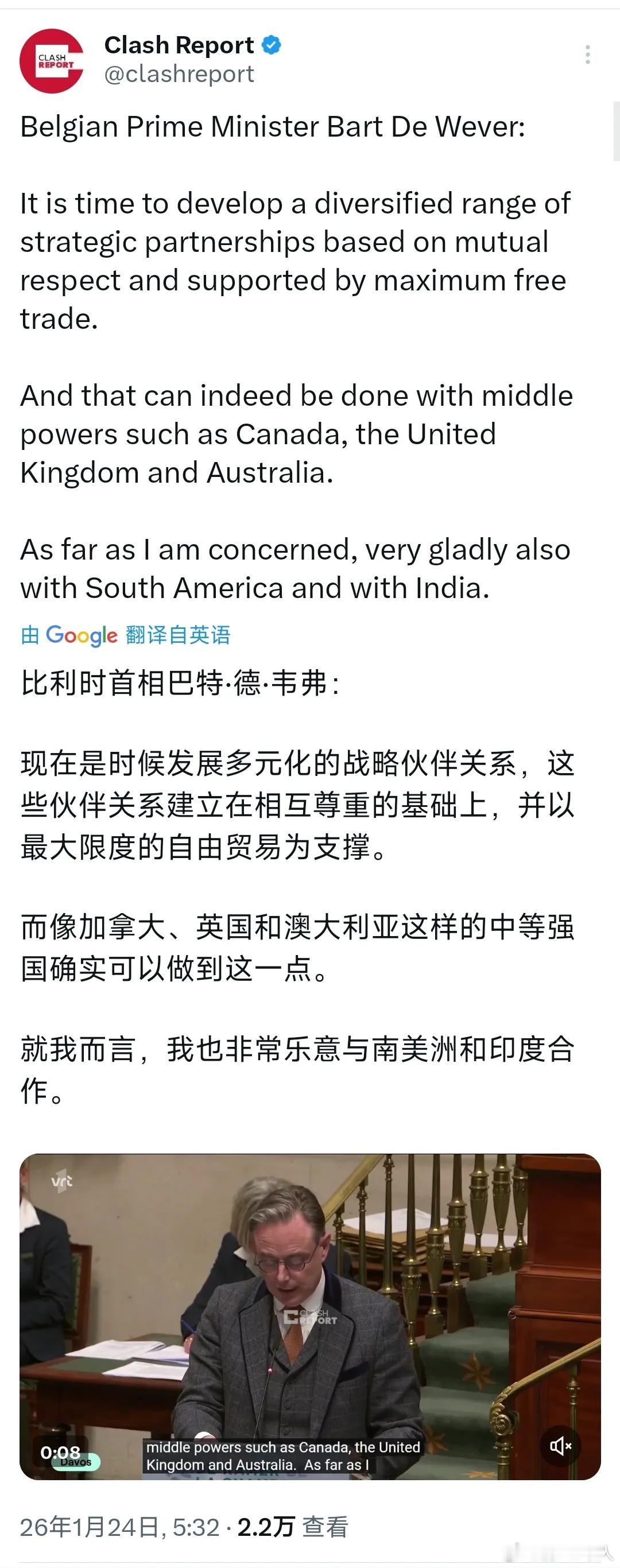 美国这种要抢格陵兰岛格陵兰岛后,比利时首相巴特·德韦弗:“美国是北约最强大的国家。但我们的尊严不是用来买卖的。我们不是奴隶。现在是时候发展多元化的战略伙伴关系,这些伙伴关系建立在相互尊重的基础上,并以最大限度的自由贸易为支撑。而像加拿大,英国和澳大利亚这样的中等强国确实可以做到这一点。就我而言,我也非常乐意与南美洲和印度合作。”这货提印度,提南美等,就是不提比利时重要多的贸易伙伴中国,所以这些人就是活该被美国打脸。