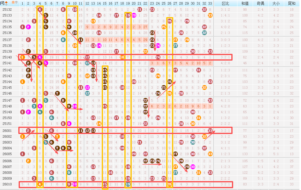 双色球26011期一等奖选号思路!上期一组连号和金胆2码全中。 26010期开出4.9.10.15.19.26,区间比为3:2:1,奇偶比3:3,大小比为2:4。4码冷号,1码重号。从近30期走势来看,区间比开出321走势的仅有3期,25140期和26001期。相同点是都伴随着一组连号回落,斜连号走势居多。龙头4间隔11期回落,冷号开出,同属于斜连号走势。一组连号9-10,冷热组合,间隔12期同时回补走势。本期结合历史走势来看,号码重点关注,龙头看好偶数回落。前两期分别回落4码和3码。二区上期开出2码,15间隔12期回落,19属于重号走势。结合历史走势来看,本期号码关注热号走势,关注斜连号,防守重号继续回补。三区开出1码,凤尾26间隔14期回落,冷号伴随斜连号走势。本期凤尾看好偶数走势。(会员以走势图画线和解析为准)