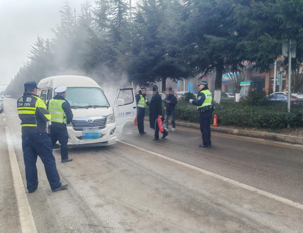 在现场,多名执勤交警携带灭火器赶到现场,分工协作。一组人员使用灭火器对准冒烟部位进行喷射扑救,另一组人员迅速对现场交通进行疏导管控,划定安全区域,防止次生事故发生。