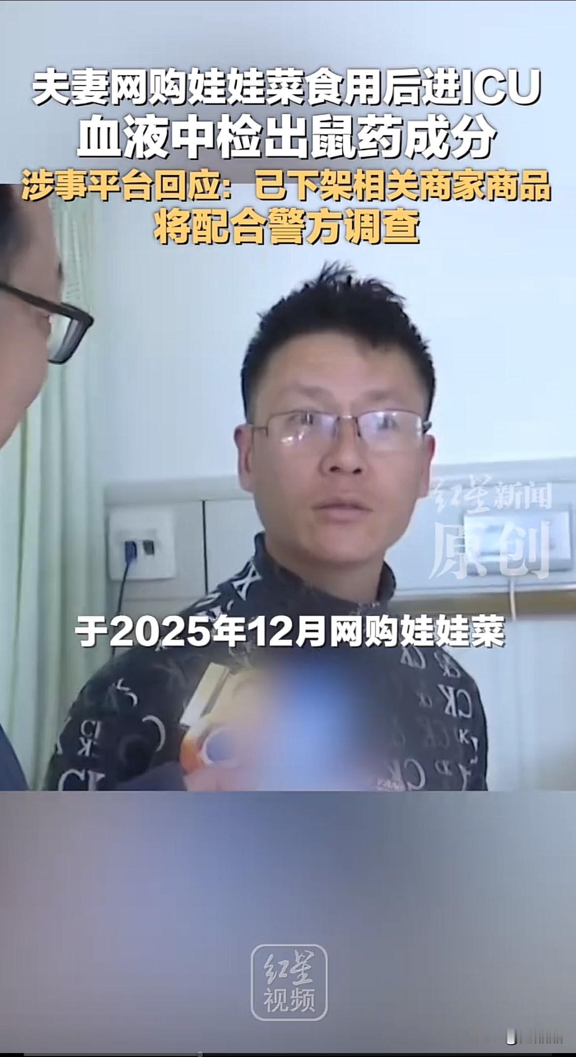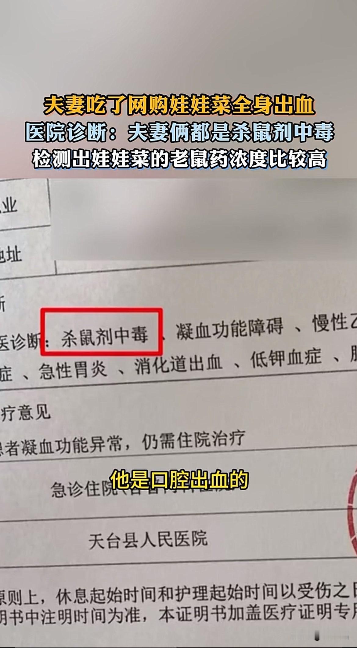 万万没想到!浙江台州,夫妻俩吃了网购娃娃菜,双双出现全身流血不止,妻子住进ICU,经检测竟是娃娃菜有老鼠药成分,在普通不过的娃娃菜竟然是害命元凶。 2025年12月14日,妻子网购了一箱娃娃菜,16日收到货后,夫妻俩煮来吃了,但吃完饭之后,两人出现嘴巴起血泡的情况,流血不止。 妻子更是晕倒昏迷住进了ICU,住院治疗了一个月才保住性命,丈夫出现口腔出血、肠道出血,呼吸衰竭。医生判定是杀鼠剂中毒。 报警后,警方把他们家里吃的穿的用的都拿去检测,发现这网购的娃娃菜和纸质包装灭鼠剂浓度最高。要知道灭鼠灵可是国家禁用的毒药,怎么会出现在吃的娃娃菜里呢? 商家否认,平台对产品进行下架。不敢相信我们经常吃的菜,含有灭鼠灵这样的毒药,这商家为了这点蝇头小利,罔顾顾客生命安全,良心何在? 近日,央视曝光云南的毒红薯、湖北天门某菜商使用禁止的高毒农药,食品安全隐患让人担忧,食品安全是民生大事,必须彻查严禁,加大管控力度,不能放过漏网之鱼。 不然单靠消费者去辨别好坏,真的难于上青天。我们只能在外观和气味上大概判断,真正吃到肚子里,才知道是否有问题,所以不要让消费者沦落到以身犯险的地步。 相关部门要建立完善的监管体系,从源头抓起,严抓重罚才能避免毒娃娃菜事件再次发生,才能让老百姓的餐桌回归安全健康,老百姓才能放心大胆吃!