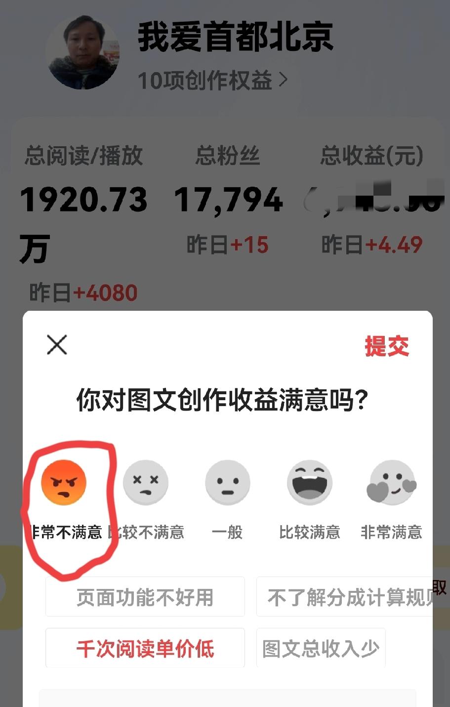大家看看头条的表情(配图),变脸比翻书还快! 他来的时候是不是两颊笑开了花,但当得到非常不满意的评价时,瞬间就是苦瓜脸! 不满意就是不满意,难不成违背心扉,说假话不成? 昨天与今天,收益从14元突降到4元,你要非常满意的答案,可能吗? 头条使性子,能胯脸,你有性子,别人也有性子,你不高兴!我也可以不高兴!