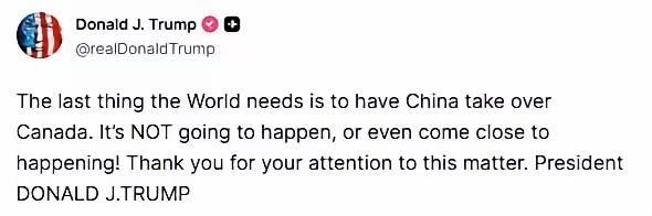 特朗普这话真是让人摸不着头脑。中国一直奉行和平外交政策,走和平发展道路,哪有什么“吞并加拿大”的想法。他这么毫无根据的发言,更像是在国际上制造无端的紧张和对立。 中国向来主张国家间平等、互利、和平共处,积极推动构建人类命运共同体。而特朗普总是抛出一些奇奇怪怪的言论,感觉就是为了博眼球,制造混乱。这种毫无逻辑的话,也只能当作笑话听听,毕竟大家都能分辨国际事务中的是非对错。