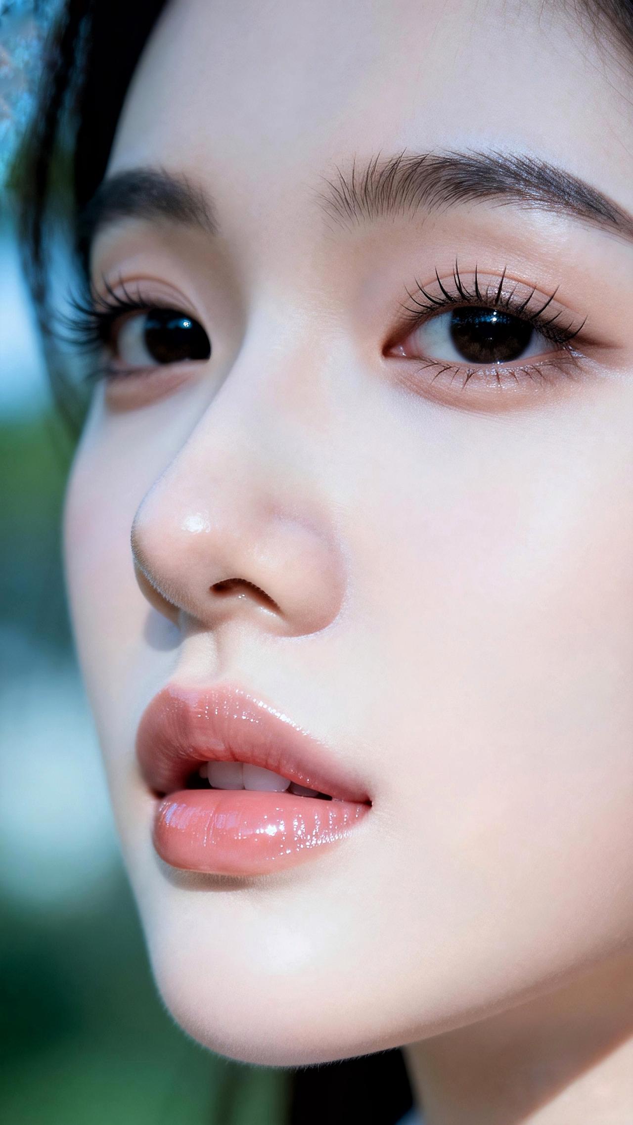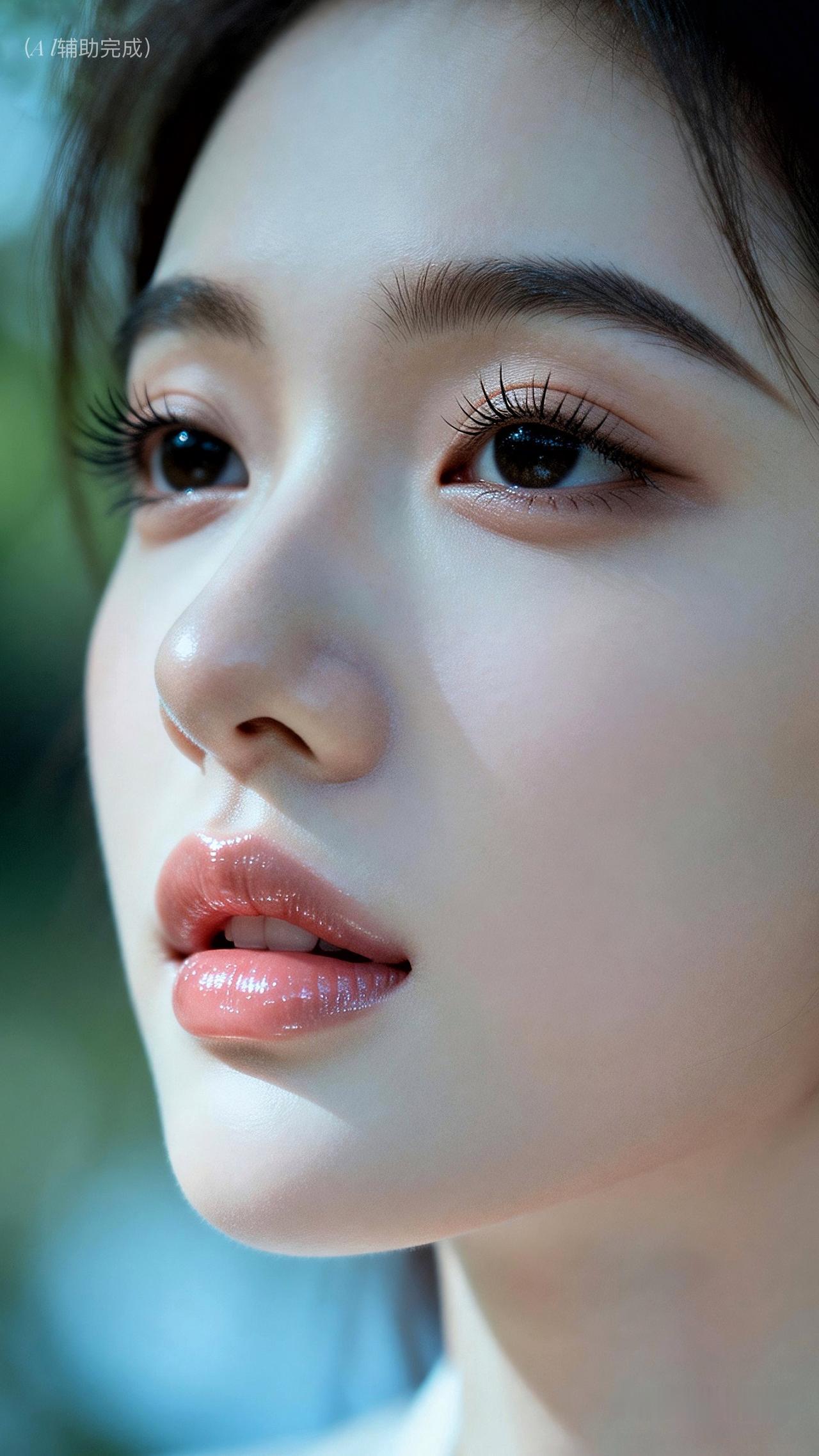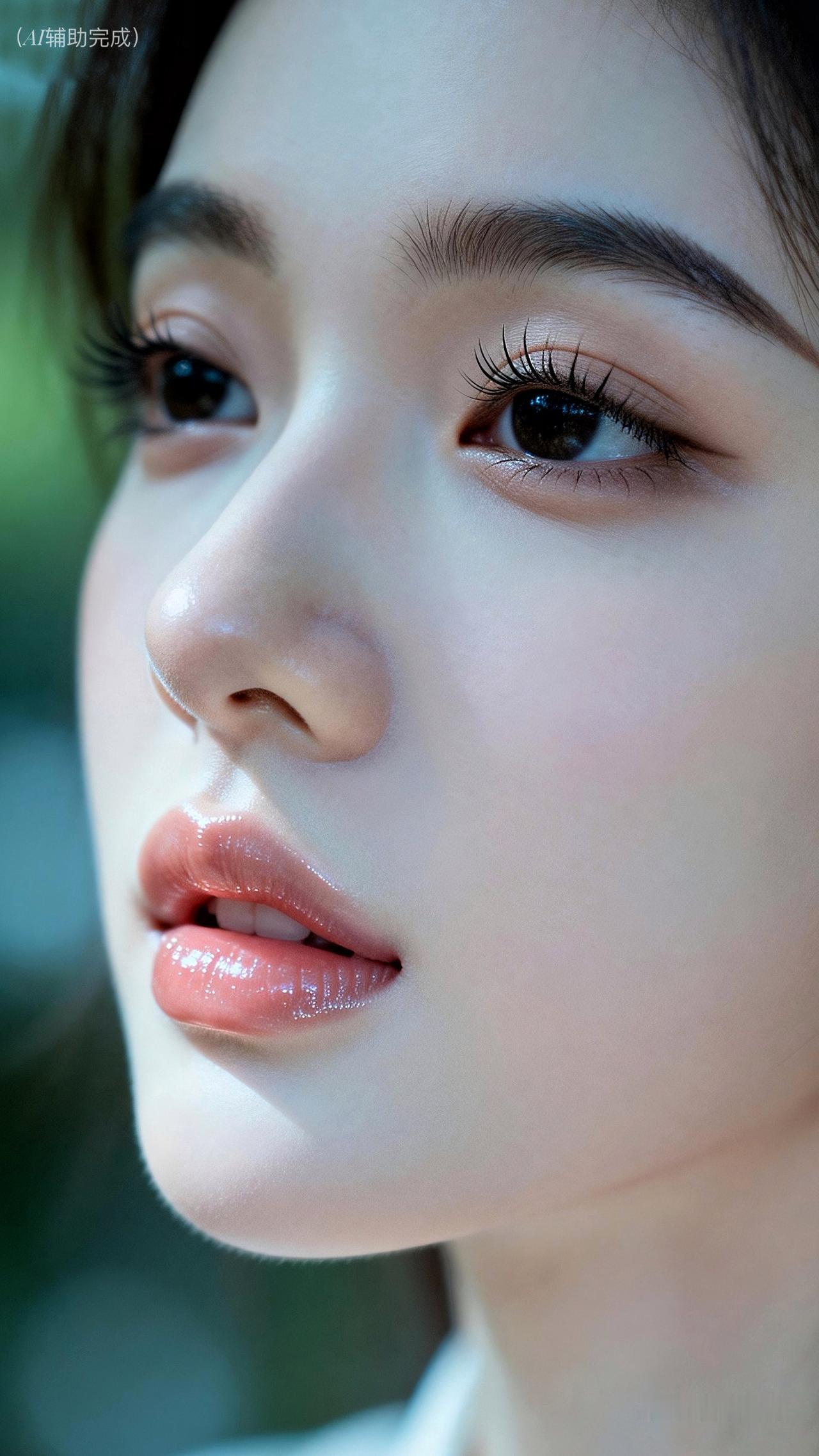 睫卷蝶翼藏星眸,眉如远山含温柔。鼻挺唇樱粉嫩娇,肌肤白皙光影柔。浅淡蓝绿虚化衬,