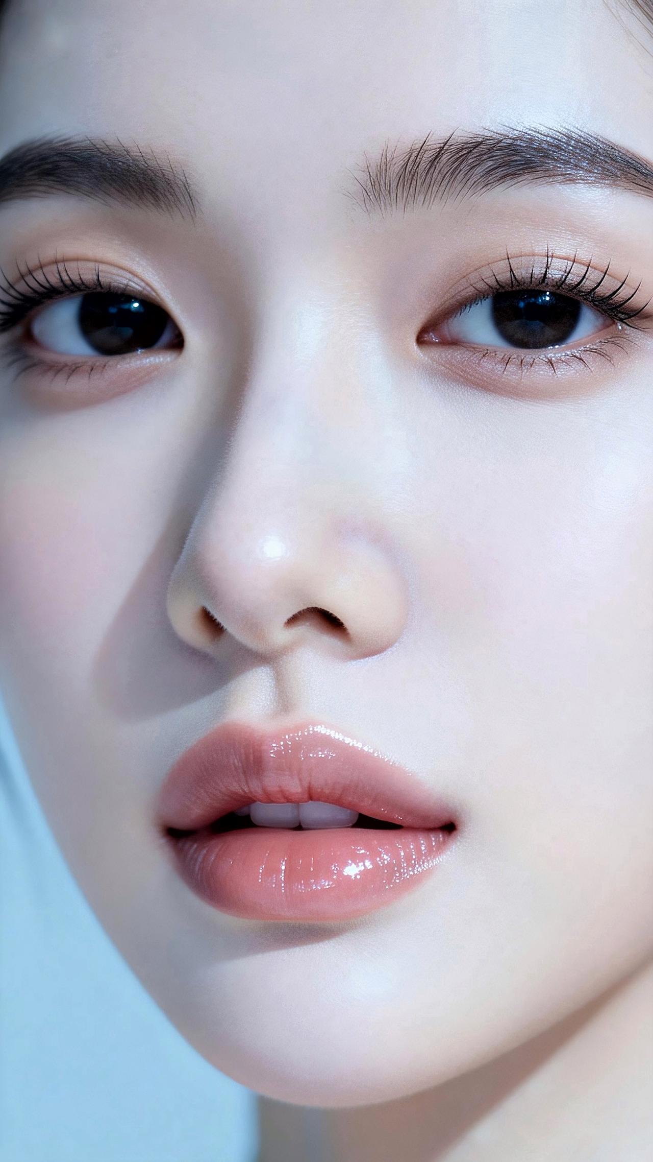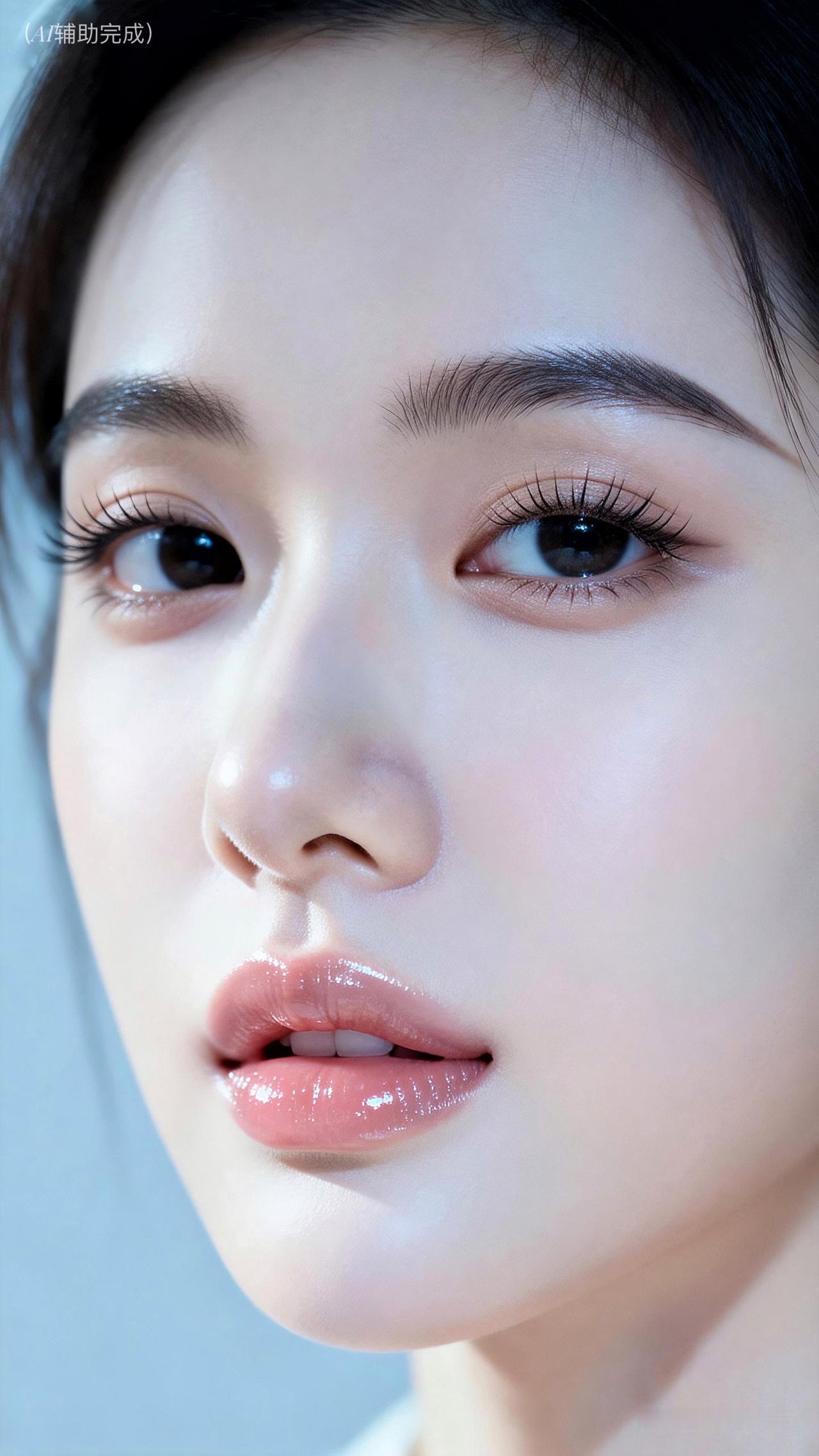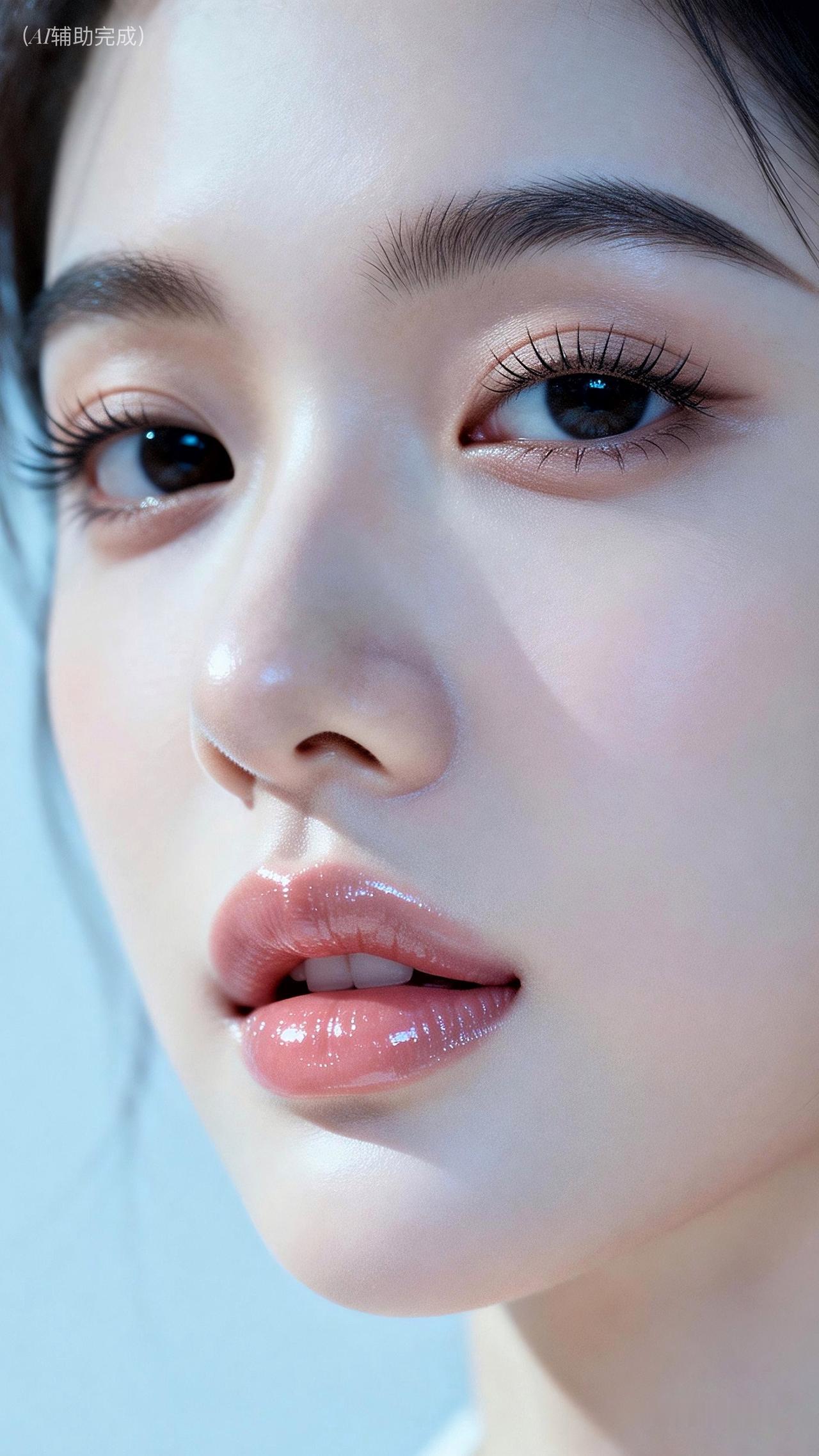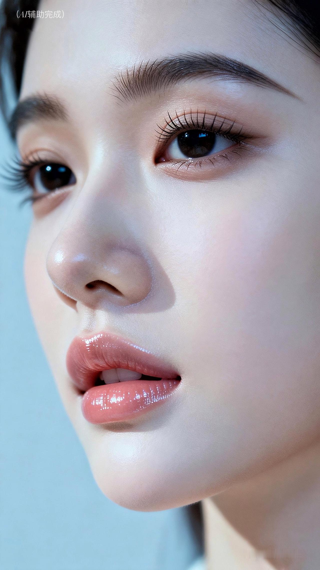 睫卷蝶翼藏星眸,眉如远山含温柔。鼻挺唇樱粉嫩娇,肌肤白皙光影柔。浅淡蓝绿虚化衬,